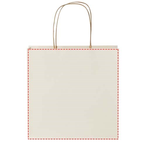 Kleine 150 g/m2 Papiertüte (24 × 9 × 24 cm) aus landwirtschaftlichen Reststoffen mit gedrehten Papiergriffen. Die personalisierbare Vorder- und Rückseite bietet viel Platz für ein Logo oder ein anderes Design und ist somit ein hervorragendes Marketinginstrument für Unternehmen. Hergestellt in Europa und zu 100 % recycelbar ist diese Tragetasche eine nachhaltige Wahl für umweltbewusste Unternehmen und Personen, die eine nachhaltige Verpackungslösung suchen.