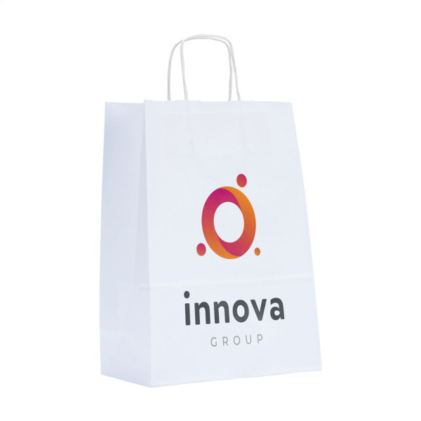 Solide Geschenktüte aus Papier (80 g/m²) im A4-Format, ideal für Werbeaktionen, Messen oder als Verpackung im Einzelhandel. Mit kurzen, stabilen Trageschlaufen aus Papier, einer Seitenfalte und einem gefalteten Boden für zusätzlichen Komfort. Die Vorder- und Rückseite sind vollständig mit einem Vollfarbdruck personalisierbar - ein budgetfreundlicher, praktischer und auffälliger Träger für Ihre Marke. 100% recycelbar. Erhältlich in Weiß und Braun.