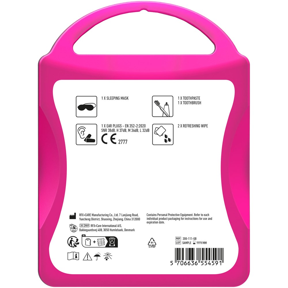 Ideales Reiseset für jede Reise. Mit diesem Set können Sie sich entspannen und erfrischen, sodass Sie ausgeruht an Ihrem Ankunftsort ankommen. Inhalt: 1 Augenmaske, 2 Ohrstöpsel, 2 Reinigungstücher. Alle im Set enthaltenen Erste-Hilfe- und Pflegeprodukte erfüllen alle geltenden EU-Vorschriften. Preis inkl. vollfarbigem Druck.