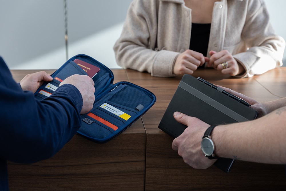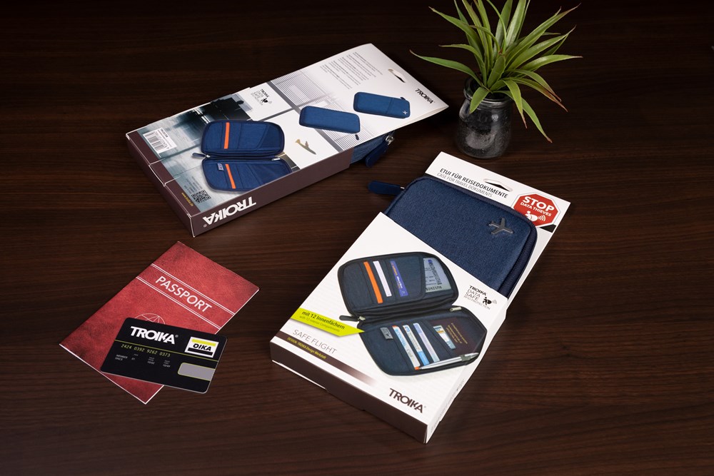 Etui für Reisedokumente, mit Ausleseschutzfolie (für RFID-Chips), Reißverschluss, 12 Innenfächer, Stiftschlaufe, 100% Polyester, Polyester, dunkelblau/orange