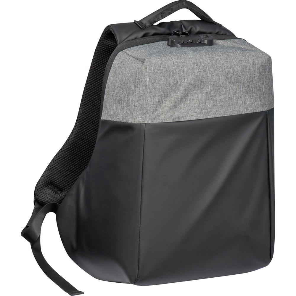 Trolleyfähiger Antidiebstahl-Hartschalen-Rucksack aus 600D Polyester mit extra vielen Funktionen: Zahlenschloss für das Hauptfach, Antidiebstahlfach am Rücken, kleines Reißverschlussfach am gepolsterten Schultergurt, gepolstertem Rückenteil, gepolstertem Tragegriff, Laptopfach mit Vorfach und Gummibändern, einem USB Port zum Anschluss einer Powerbank (im Lieferumfang nicht enthalten), vier Stifteschlaufen, Öffnung für Kopfhörer, drei Einsteckfächern und einem abnehmbaren Schlüsselring. Durch zwei Klettverschlüsse innen, lässt sich der Rucksack entweder teilweise oder ganz öffnen. Ihre Werbung wird auf der Vorderseite angebracht.