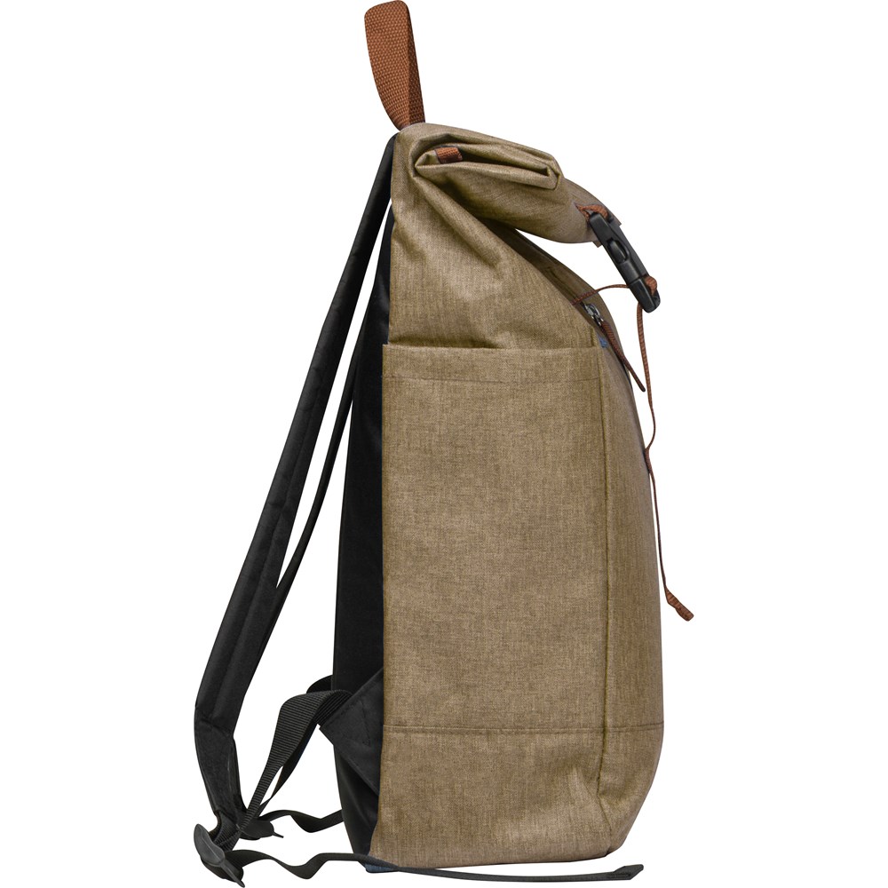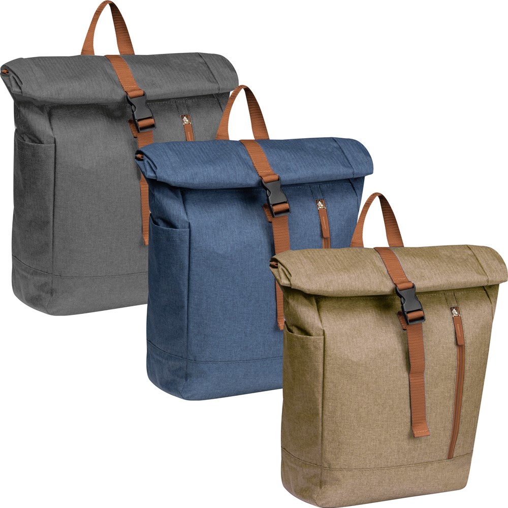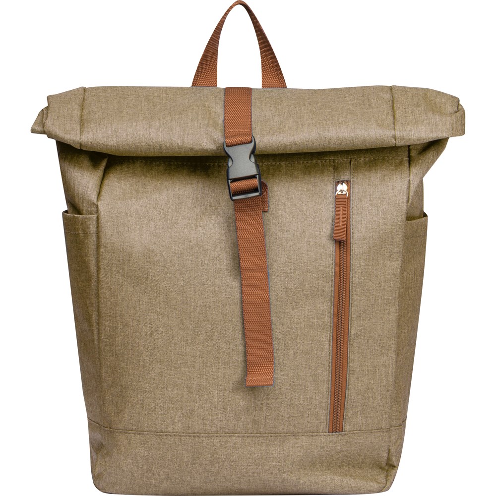 Rucksack aus 500D Polyester mit falt- bzw. rollbarem Verschluß, gepolsterten Tragegurten und Rückteil, Sicherheitsfach mit Karabiner am Rücken, zwei seitlichen Einsteckfächern außen, einem Einsteckfach innen, Tragehenkel und verschließbarem Vorfach. Ihre Werbung wird auf das Vorfach gedruckt.