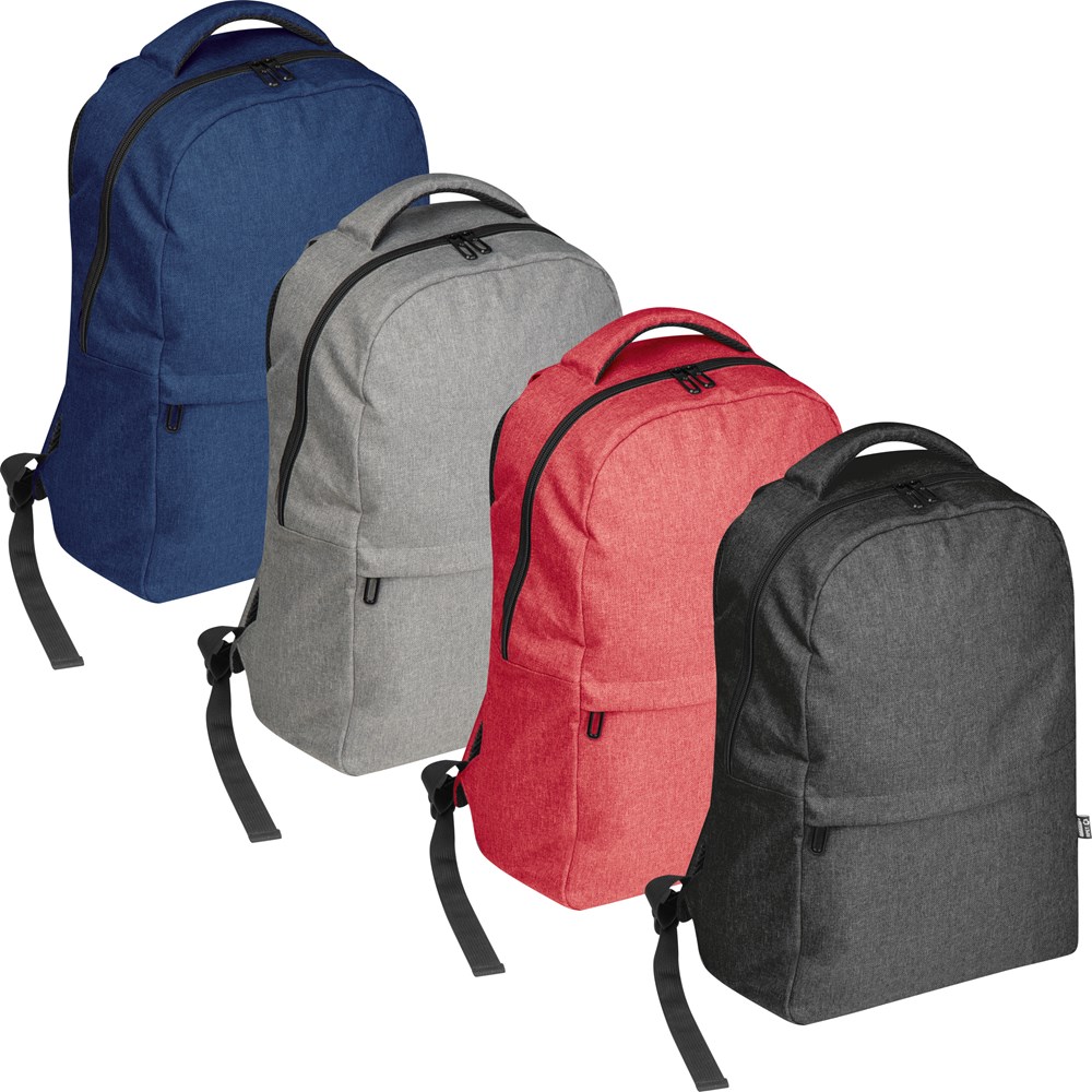 RPET (recyceltes PET) Rucksack mit USB-Anschluss, gepolsterten Tragegurten, gepolsterten Rückteil, Laptopfach, Reißverschlussvorfach und Antidiebstahlfach am Rücken. Durch den USB-Anschluss an der Außenseite, lässt sich z.B. das Smartphone während des Tragens aufladen. Hierfür innen einfach eine Powerbank (nicht im Lieferumfang enthalten) an den USB-Stecker anschließen. Ihre Werbung drucken wir auf das Vorfach.