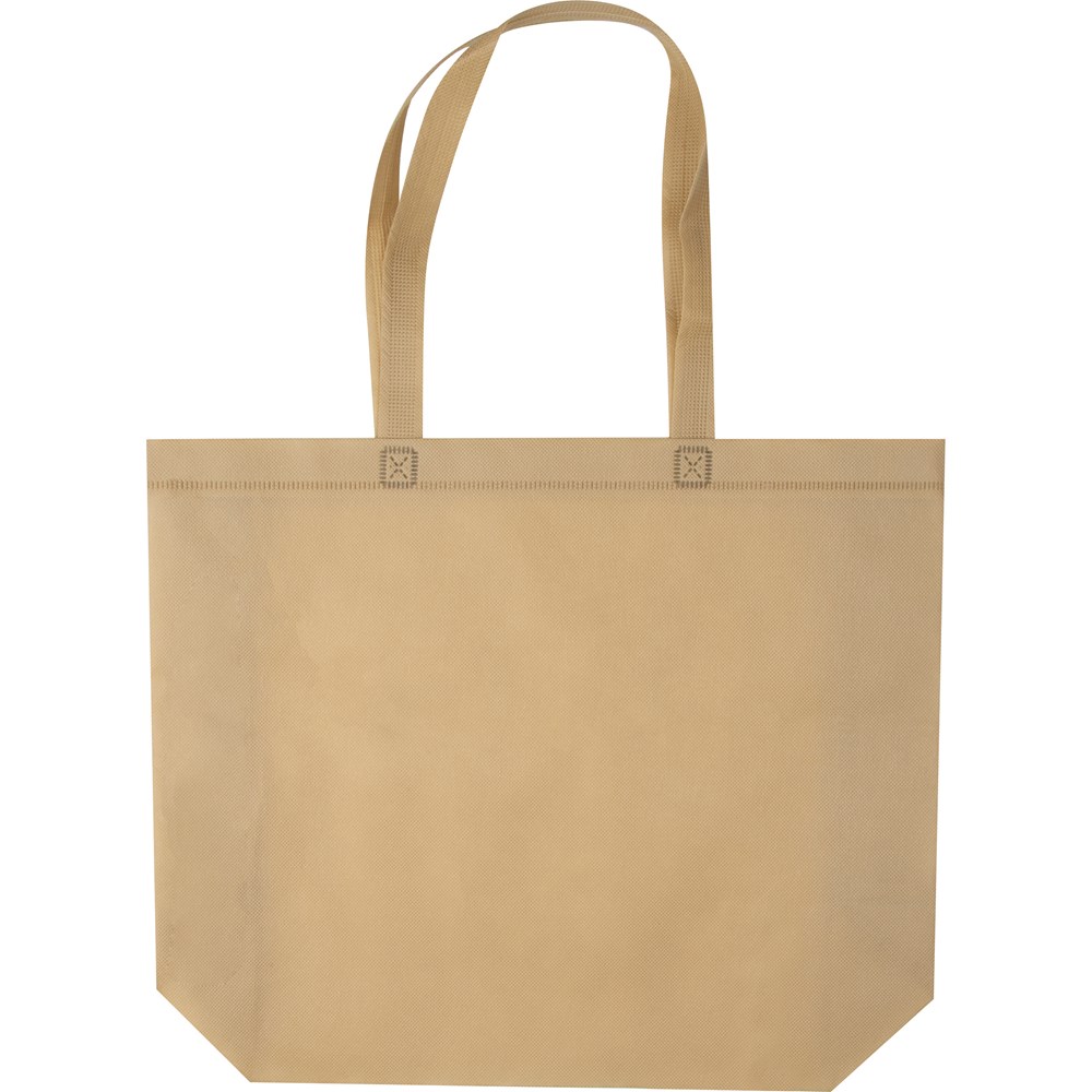 Große naturfarbene Non Woven Tasche mit einer Grammatur von 80g/m², einer Bodenfalte und langen Henkeln. Ihre Werbung wird auf eine Seite gedruckt. Für 2C oder mehr, Preise auf Anfrage.