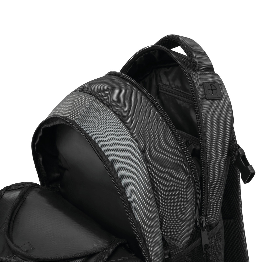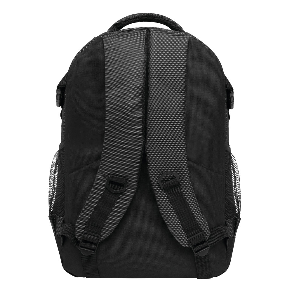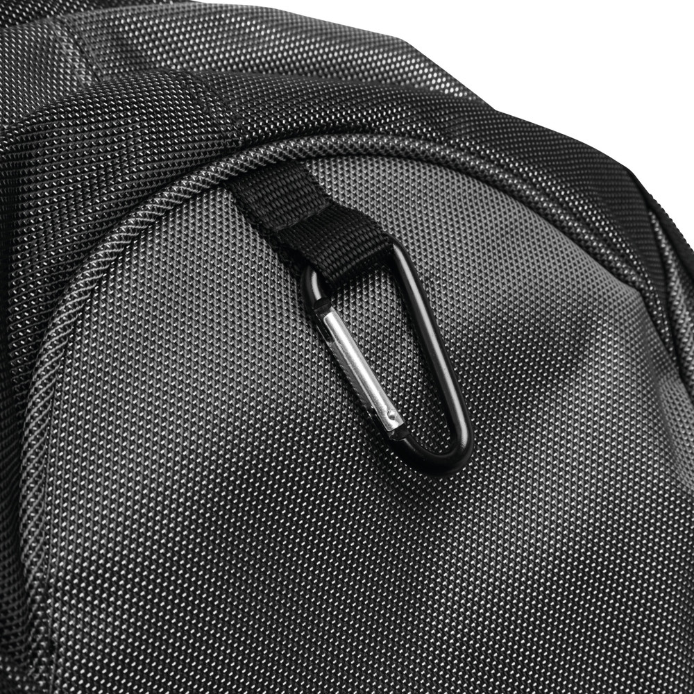 Rucksack HIGH-CLASS: Reißverschluss-Vorfach außen mit Karabinerhaken, Reißverschluss-Hauptfach mit Steckfach und kleiner Reißverschlusstasche innen sowie mit Kopfhörer-Kabelausgang, 2 seitliche Netzfächer und Kompressionsgurte, verstärkter Tragegriff, Schultergurte und Rückenbereich mit komfortabler Polsterung, der Karabiner ist NICHT als Sicherung beim Klettern geeignet