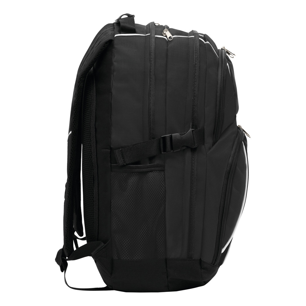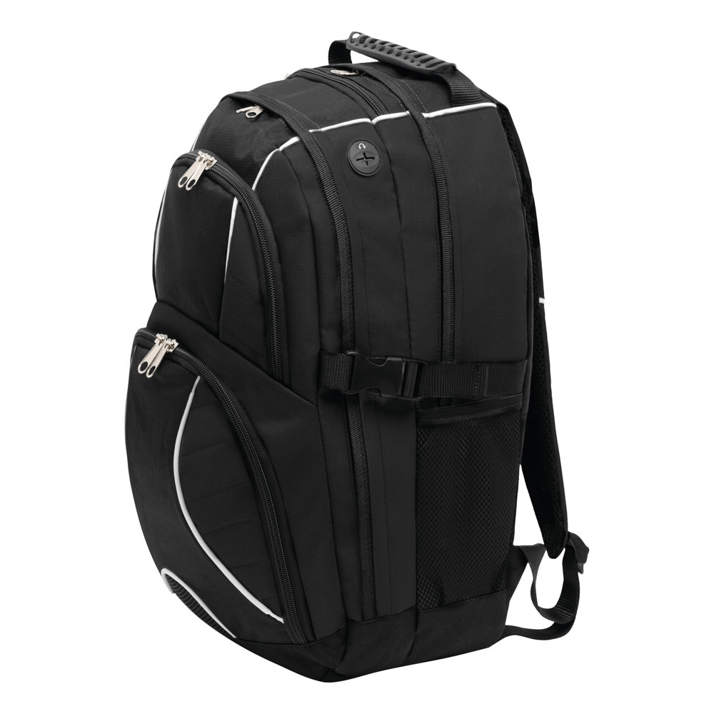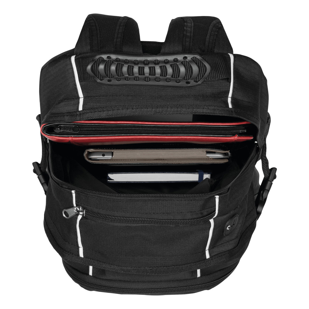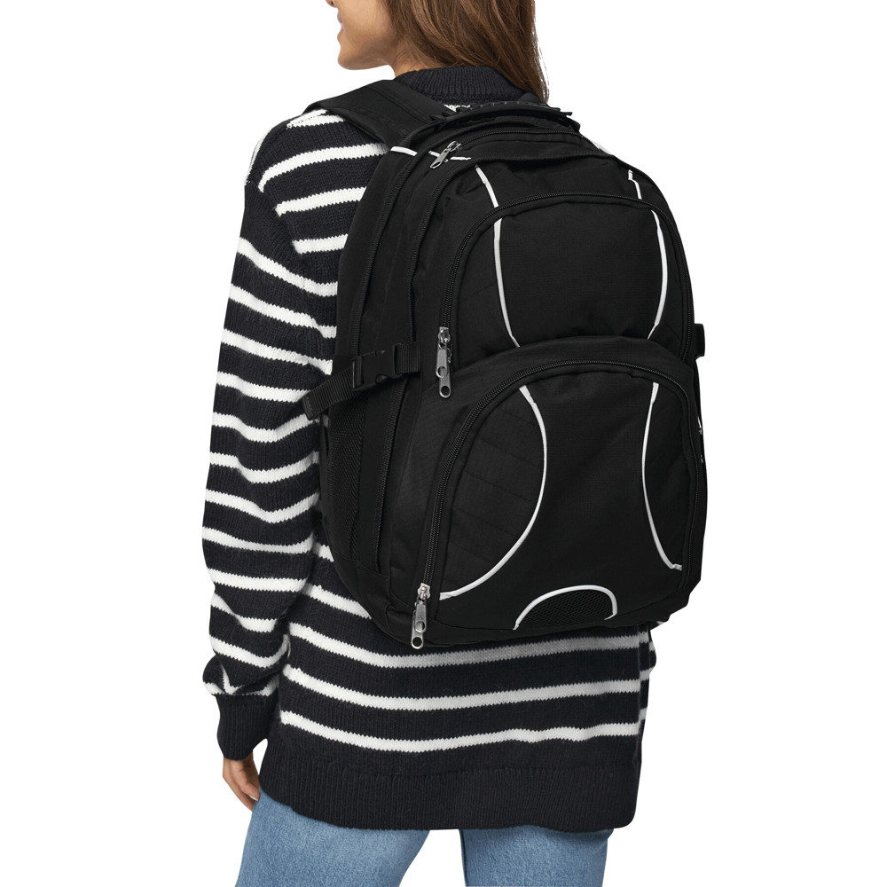 Rucksack HYPE: 2 Reißverschluss-Vorfächer – eins davon mit kleinem Organizerfach, 2 Reißverschluss-Hauptfächer; eines mit gepolstertem Notebookfach, das andere Reißverschluss-Hauptfach mit Kabelausgang und extra gepolstertem Fach für z.B. Smartphone oder andere Geräte, 1 Reißverschluss-Schlüsselfach, 2 seitliche Netzeinsteckfächer und Kompressionsgurte, verstärkter Tragegriff, gepolsterte Schultergurte und Rückenbereich