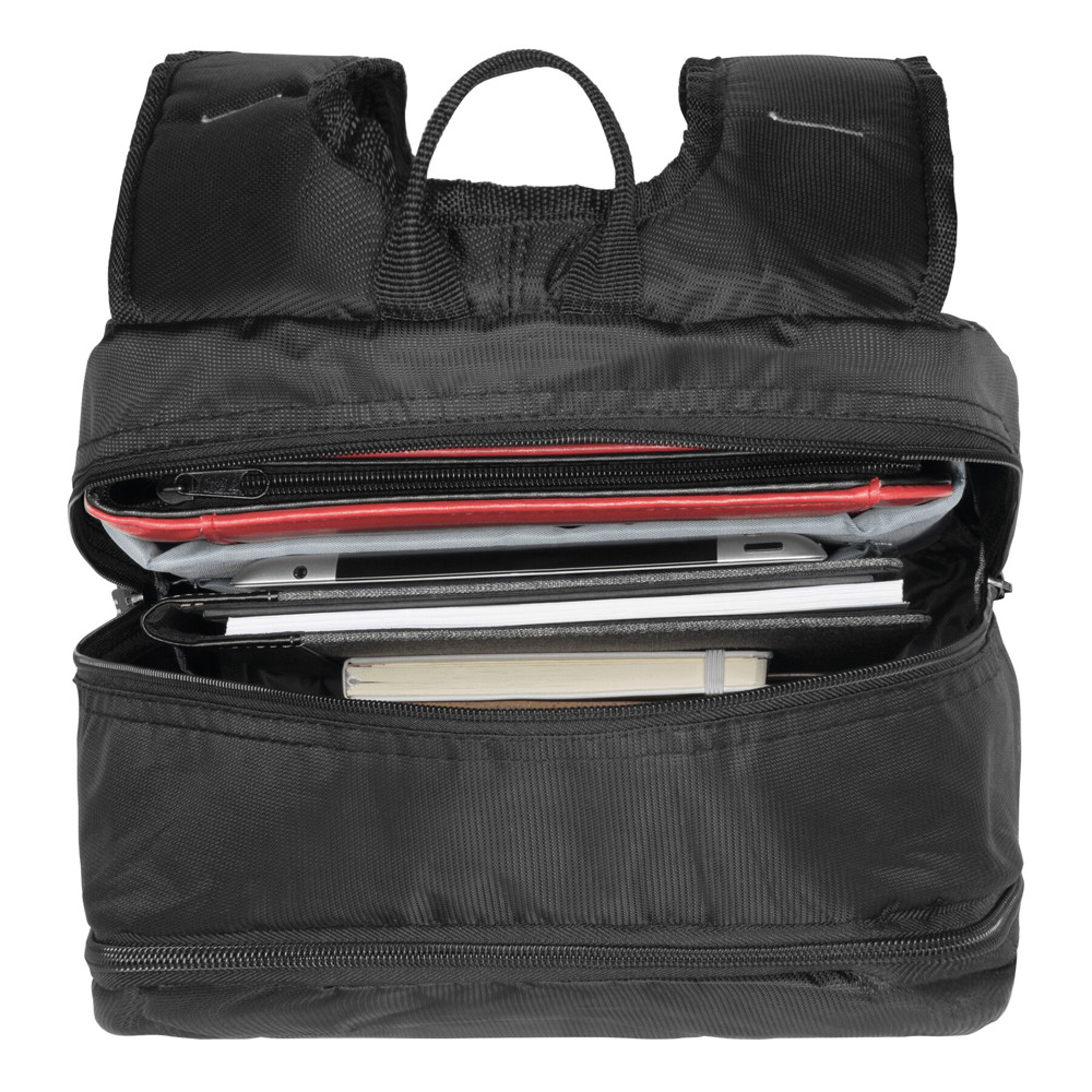 Rucksack TALLINN: 1 Reißverschluss-Vorfach mit Organizer, kleine vertikale Vortasche mit farbigem Reißverschluss, 1 Reißverschluss-Hauptfach mit gepolstertem Innenfach für Laptop oder Tablet plus extra gepolstertes Einsteckfach, 2 seitliche Netzfächer, Trageschlaufe, gepolsterte Schultergurte und Rückenbereich