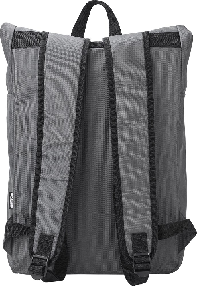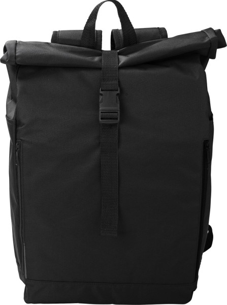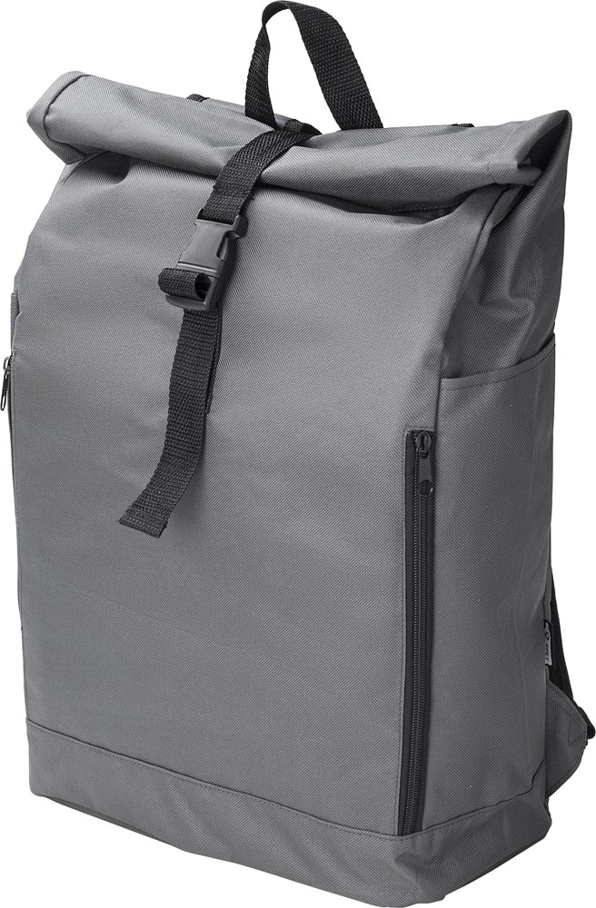 Rucksack aus rPET-Polyester (600D) mit Rollverschluss. Zwei Reißverschlusstaschen an der Seite. Ein großes Fach. Klettverschluss und Schnallenverschluss.
