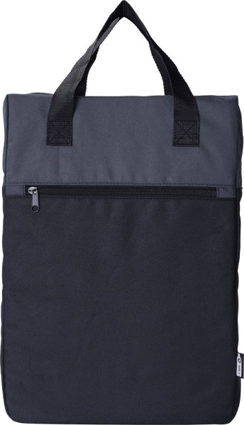 Rucksack aus rPET-Polyester (600D). Ein Fach. Eine Fronttasche mit Reißverschluss. Farbige Details auf der Oberseite, schwarz auf der Unterseite. Tragegriffe an der Oberseite.