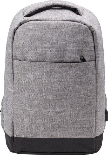 Rucksack aus Polyester (600D) mit PVC Rückenteil, Laptopfach (ca. 35cm), diversen Innenfächern (inkl. Anti-Diebstahl Fach), RV-Fach, RV-Fach an der Außenseite und seitlichem USB-Anschluss mit innenliegendem Kabel (ohne Powerbank).