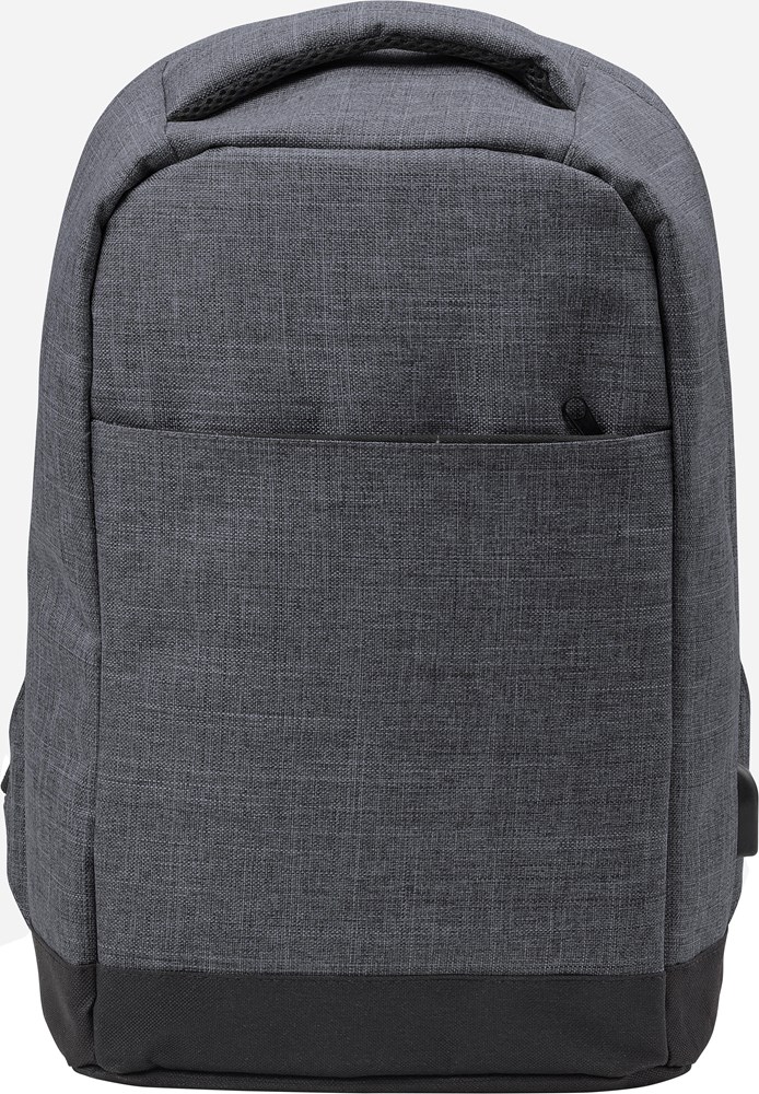 Rucksack aus Polyester (600D) mit PVC Rückenteil, Laptopfach (ca. 35cm), diversen Innenfächern (inkl. Anti-Diebstahl Fach), RV-Fach, RV-Fach an der Außenseite und seitlichem USB-Anschluss mit innenliegendem Kabel (ohne Powerbank).