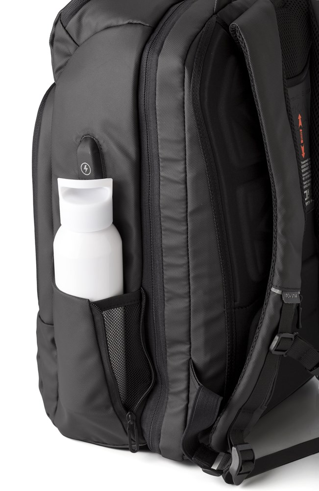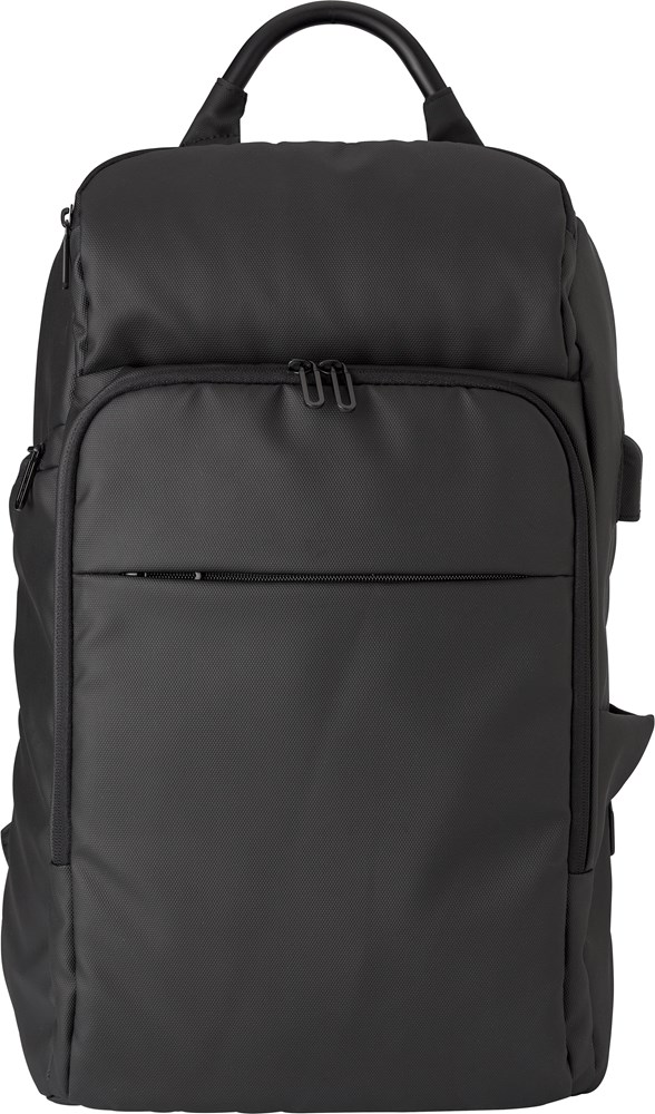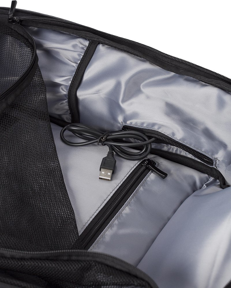 Laptop-Rucksack aus Polyester (600D) mit Taschen an der Vorder- und Innenseite. Verfügt über ein gepolstertes Laptopfach (passend bis 15''), einen gepolsterten Rücken und verstellbare Schultergurte. Leichter Rucksack mit USB-Anschluss und Kabel.