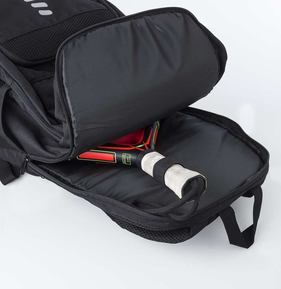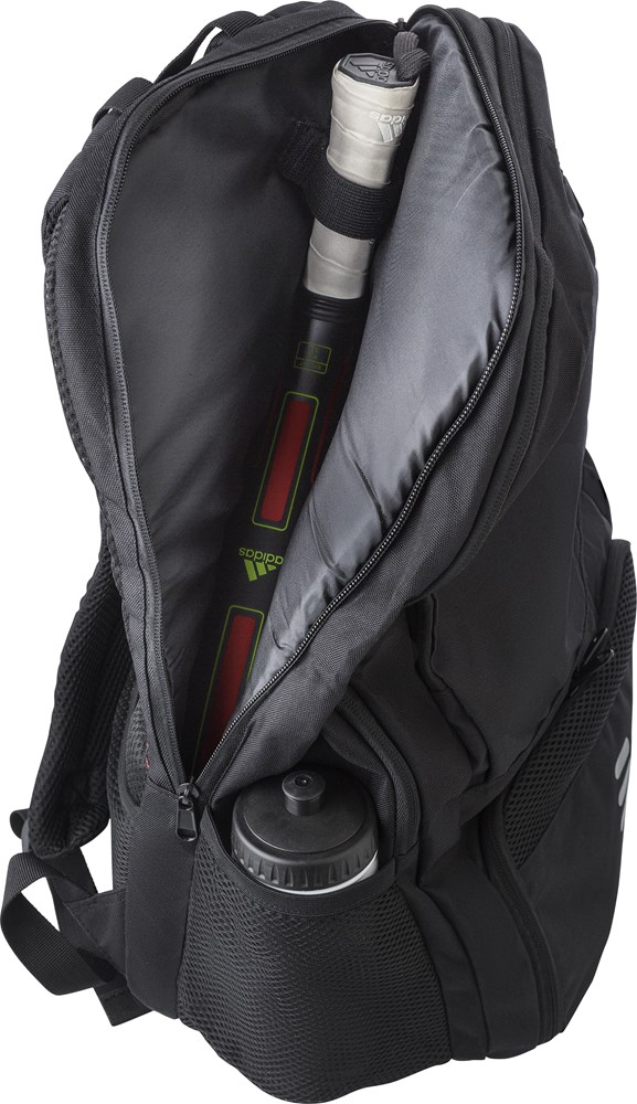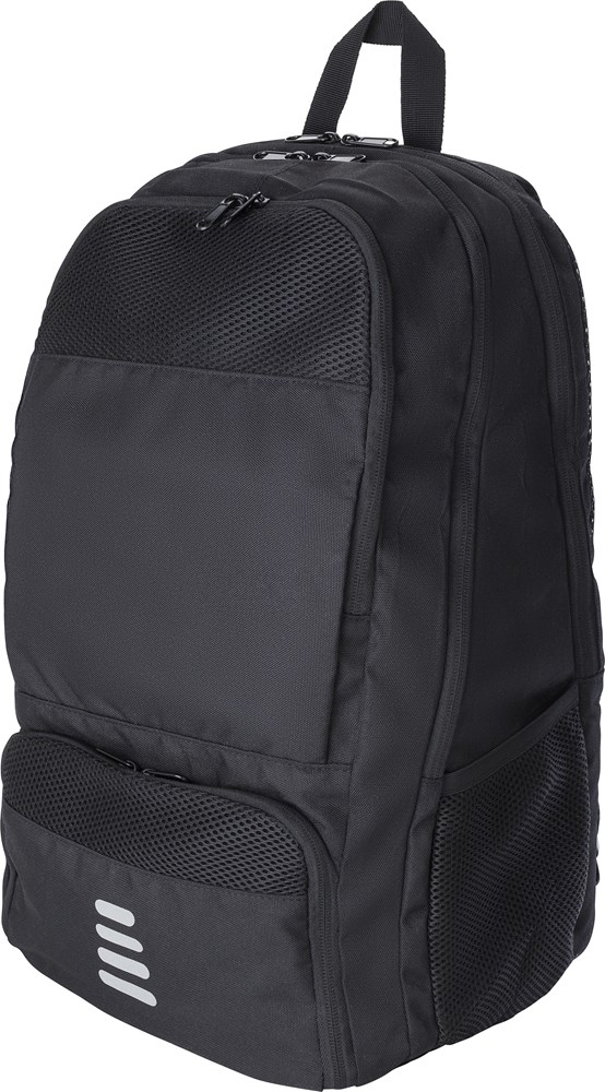 rPET-Polyester-Multifunktionsrucksack. 210D Futter und rPET 600D außen. Zu den Funktionen gehören: Schlägertasche, Anti-Diebstahl-Tasche, Schuhtasche, Laptop-Tasche, Flaschenfächer. Die Tasche hat gepolsterte, verstellbare Gurte und ist wasserabweisend (recycelte Beschichtung).