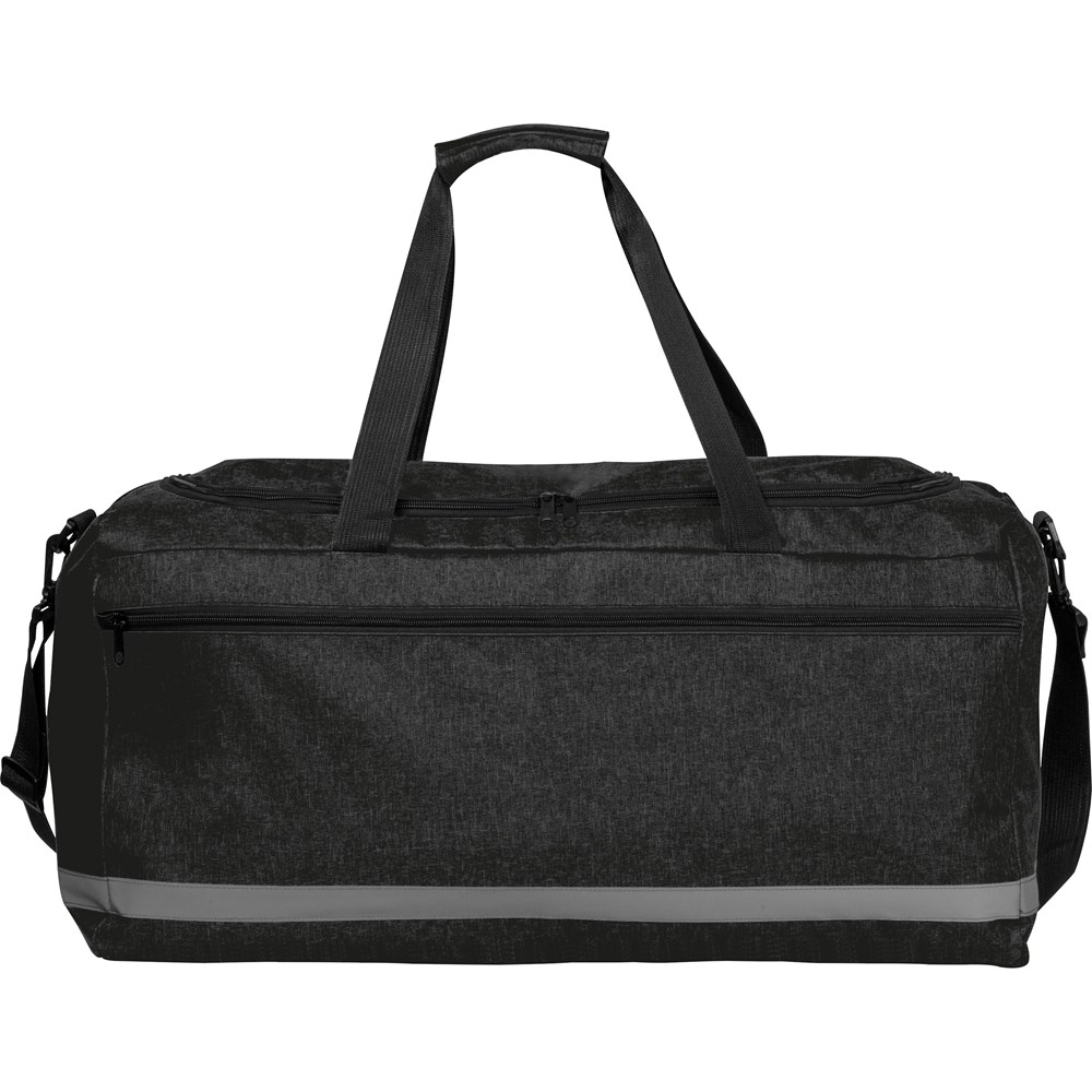 Große Sporttasche aus 600D Polyester mit Reflektorstreifen. Neben dem geräumigen Innenfach verfügt die Tasche noch über ein zusätzliches Reißverschlussfach an der Seite. Die beiden Tragegriffe sowie der verstellbare Schultergurt sorgen für einen bequemen Transport. Ihre Werbung drucken wir auf das Reißverschlussvorfach.