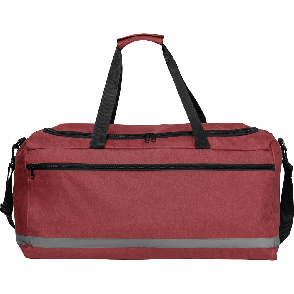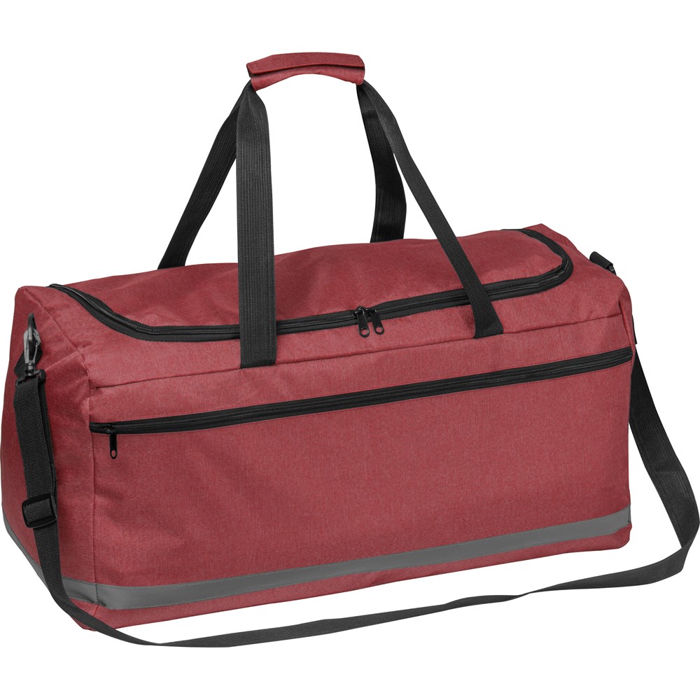 Große Sporttasche aus 600D Polyester mit Reflektorstreifen. Neben dem geräumigen Innenfach verfügt die Tasche noch über ein zusätzliches Reißverschlussfach an der Seite. Die beiden Tragegriffe sowie der verstellbare Schultergurt sorgen für einen bequemen Transport. Ihre Werbung drucken wir auf das Reißverschlussvorfach.