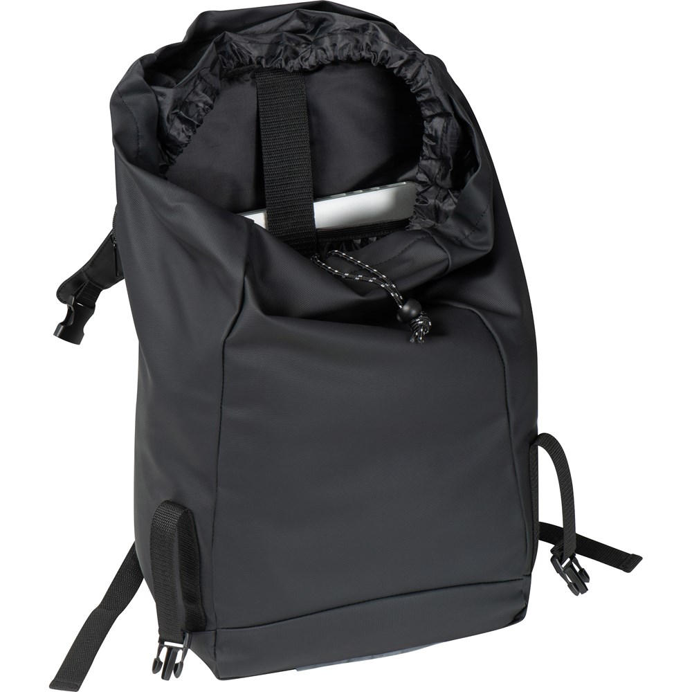 Großer Rucksack aus Polyester mit wasserabweisender PU-Beschichtun. Er verfügt neben dem großen Hauptfach mit Laptopfach und gepolsterter Rückseite noch über zwei Reißverschlussfächer rechts und links außen sowie eine Zugkordel zum Verschließen und einem Überschlag der den Inhalt bei Regen trocken hält. Ihre Werbung drucken wir auf die Vorderseite des Rucksacks.