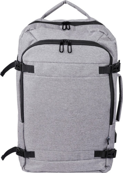 Rucksack und Laptoptasche (17”) aus rPET-Polyester (300D) mit 210D-Innenfutter. Mit Trageschlaufe oben und seitlich. Laptopfach mit Klettverschluss, diebstahlsichere Tasche und zwei große Fächer mit Reißverschluss. Belüftete, gepolsterte Rückseite, Trolleyriemen, Verschlussschnallen und USB-A-Anschluss an der Seite. Mit seitlichen Schnallen, um das Gepäck kompakt zu halten. Tragegewicht ca. 12 kg. Inklusive rPET-Etikett.