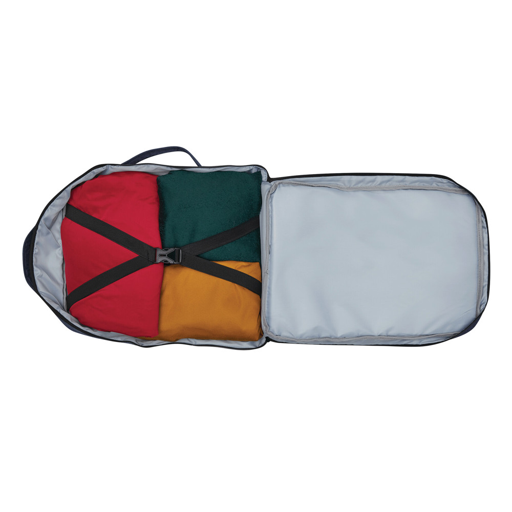 Rucksack STEWARD: 2 Reißverschluss-Vorfächer, eins davon mit Organizer (3 Steckfächer, 2 Stifteschlaufen), 1 großes gepolstertes Reißverschluss-Hauptfach mit Packgurt, 1 gepolstertes Reißverschluss-Laptopfach, jeweils 1 verstärkter Top- und Seitengriff, gepolsterte Schultergurte in ergonomischer Form und gepolsterter Rückenbereich, Gurt als Reporterfunktion auf der Rückseite, seitlich je 2 Kompressionsgurte mit Schnappverschluss