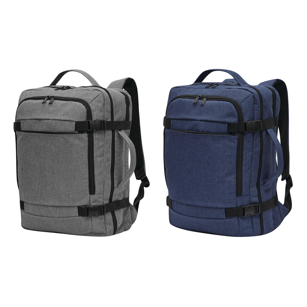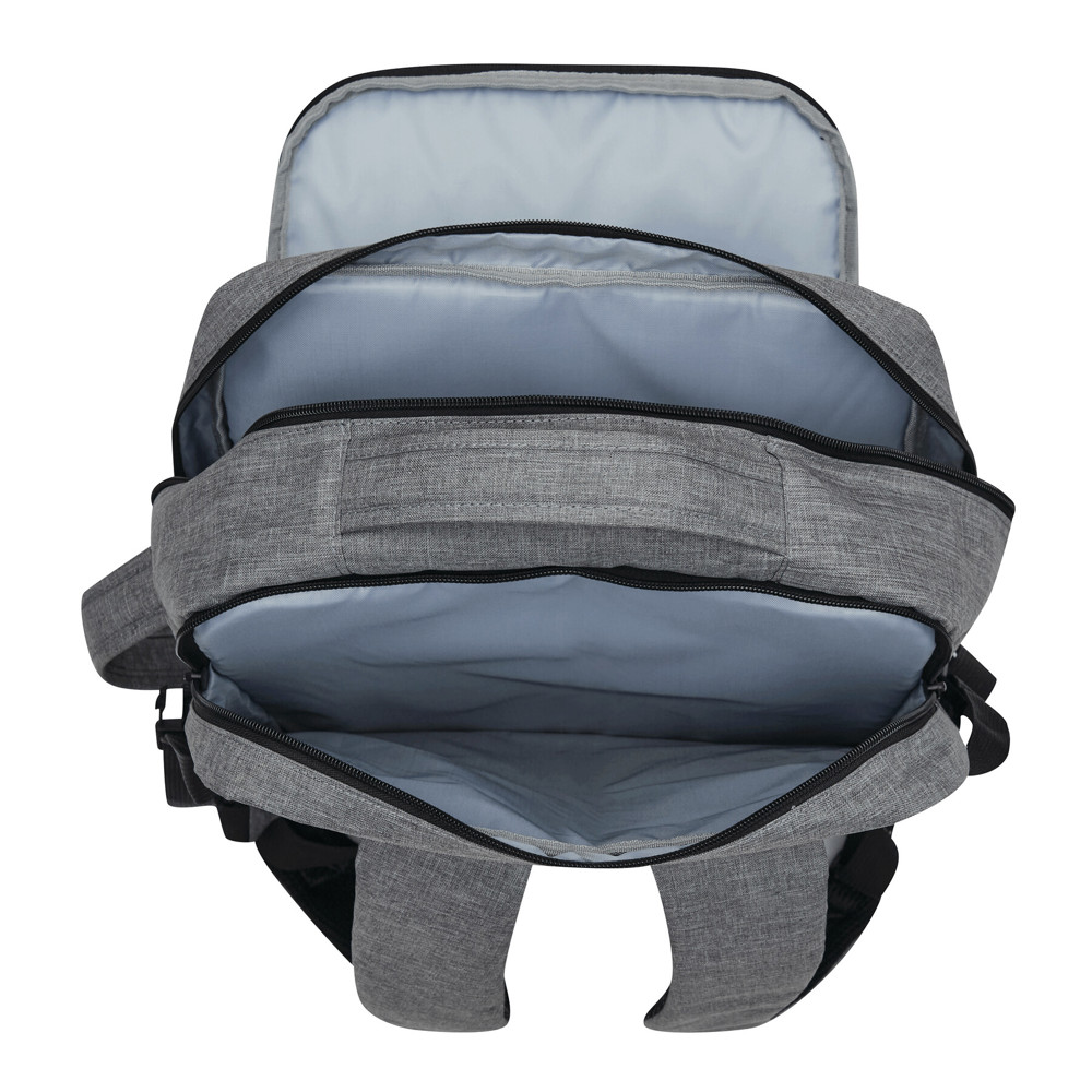 Rucksack STEWARD: 2 Reißverschluss-Vorfächer, eins davon mit Organizer (3 Steckfächer, 2 Stifteschlaufen), 1 großes gepolstertes Reißverschluss-Hauptfach mit Packgurt, 1 gepolstertes Reißverschluss-Laptopfach, jeweils 1 verstärkter Top- und Seitengriff, gepolsterte Schultergurte in ergonomischer Form und gepolsterter Rückenbereich, Gurt als Reporterfunktion auf der Rückseite, seitlich je 2 Kompressionsgurte mit Schnappverschluss