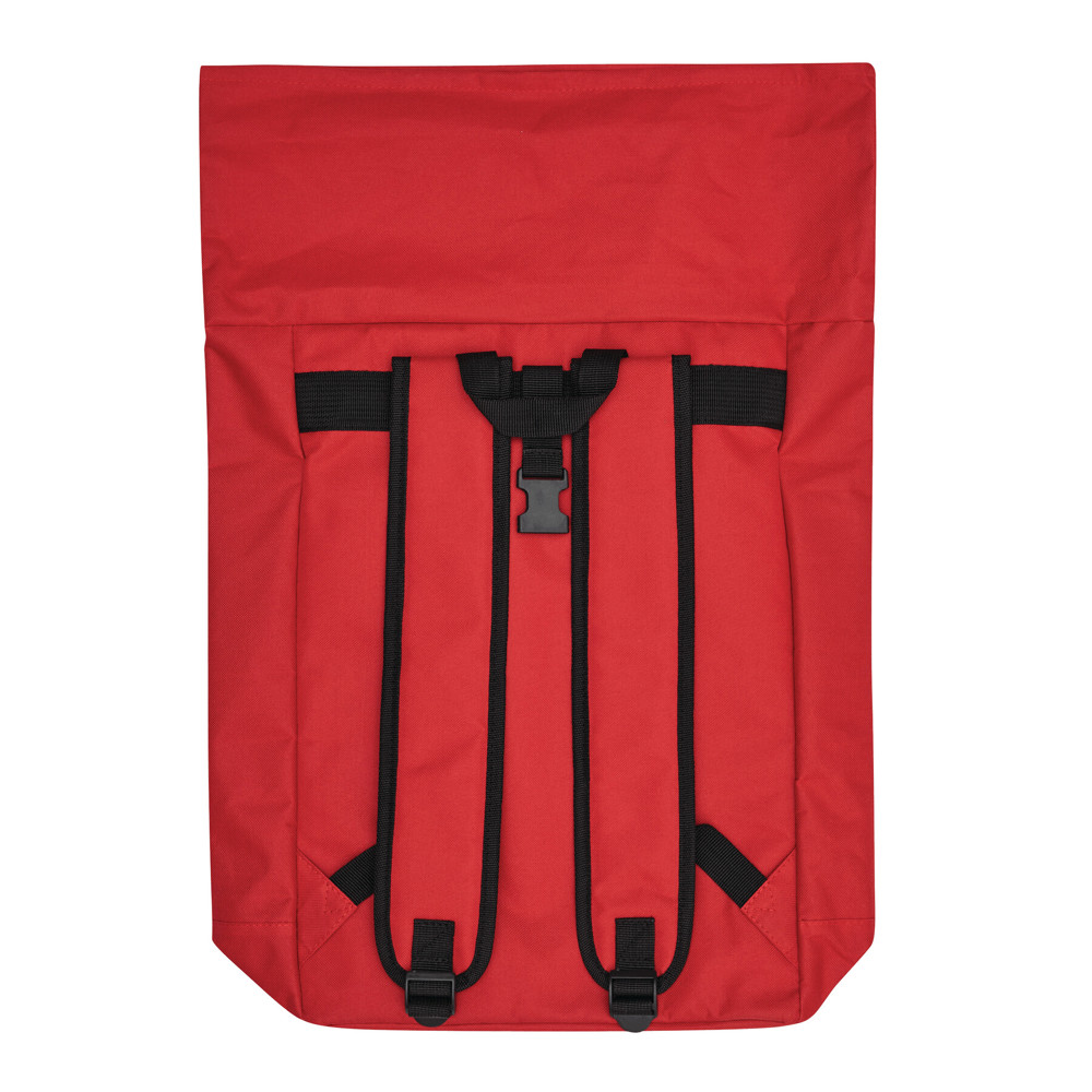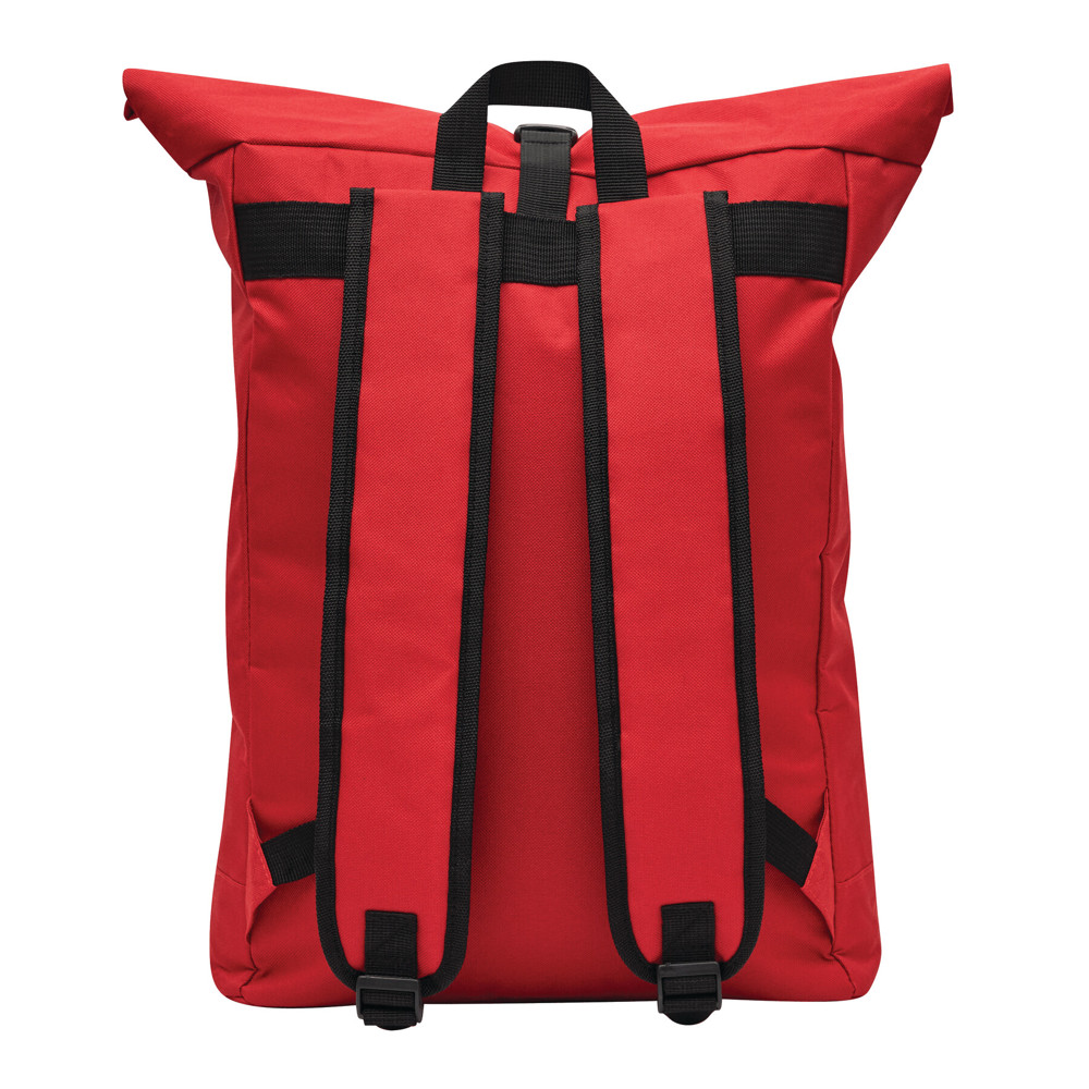 Rucksack ROLL-TOP: aus recyceltem Kunststoff (RPET), horizontales Reißverschluss-Vorfach, großes Hauptfach mit gepolstertem Innenfach für Laptop oder Tablet, aufrollbar und mit Schnappverschluss verschließbar, Trageschlaufe, gepolsterter Boden, Schultergurte und Rückenbereich