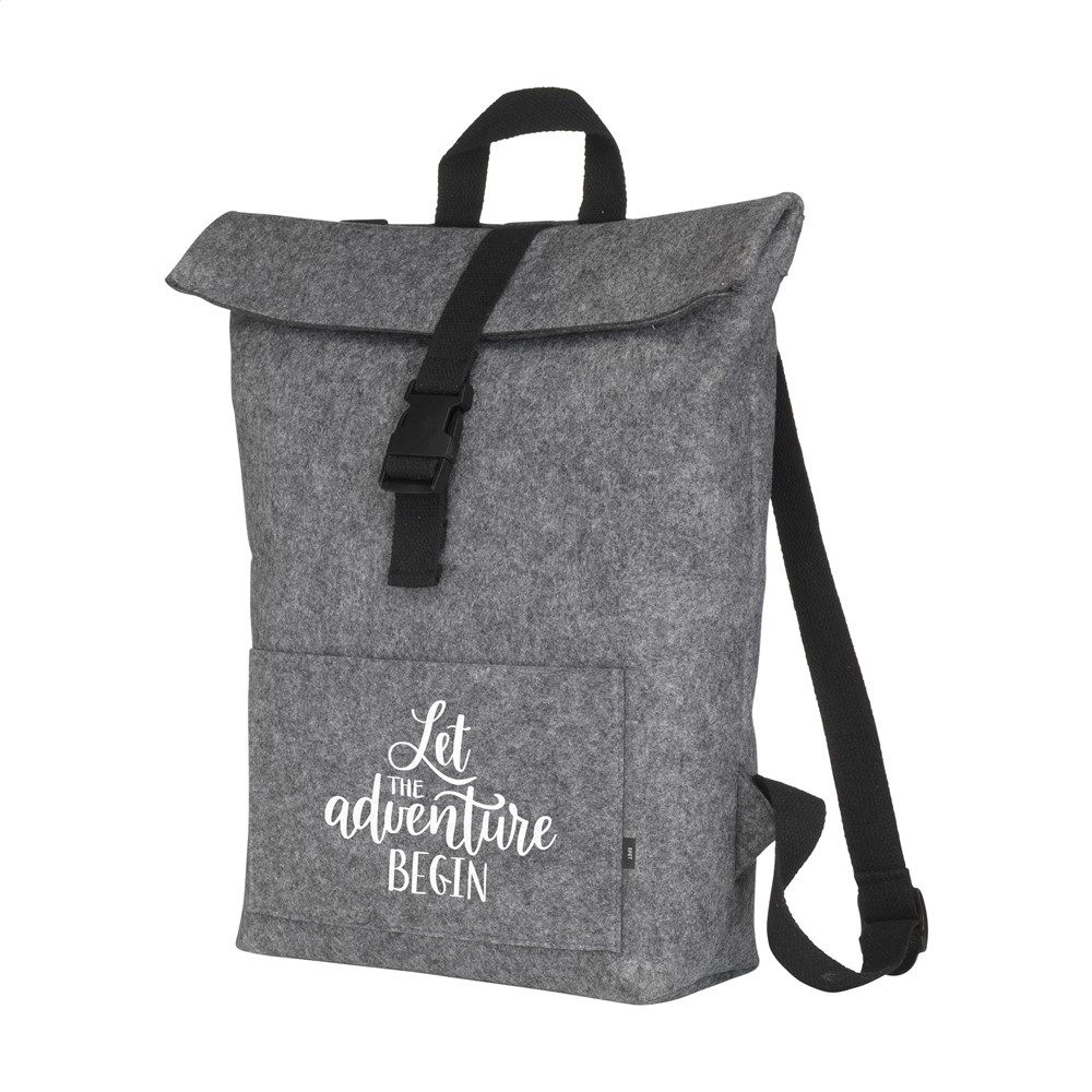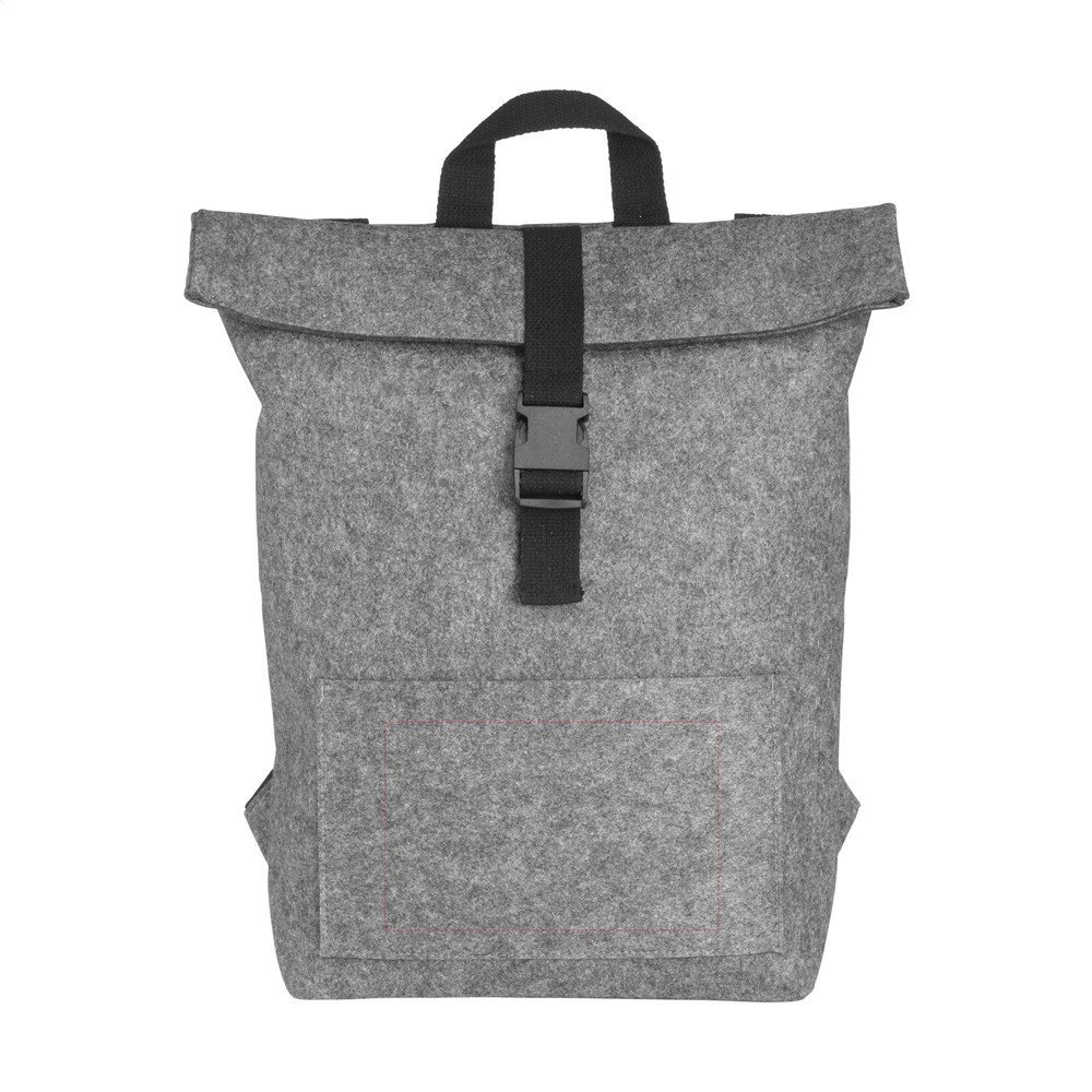 Robuster, praktischer „Roll-Top“-Rucksack aus stabilem RPET Filz. Der Rucksack hat ein geräumiges Innenfach und eine Tasche vorne. Mit Trageschlaufe, Rollverschluss und praktischem Klicksystem. GRS-zertifiziert. Gesamtes recyceltes Material: 80%. Fassungsvermögen ca.15 Liter.