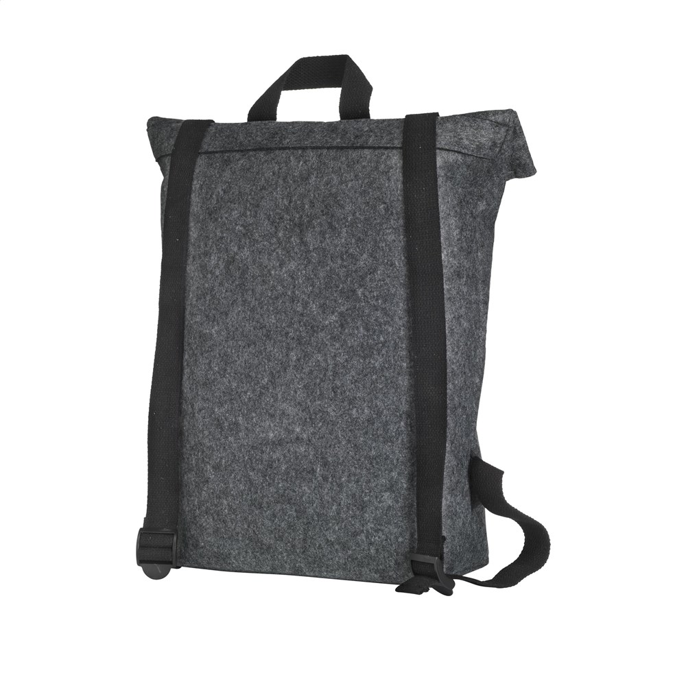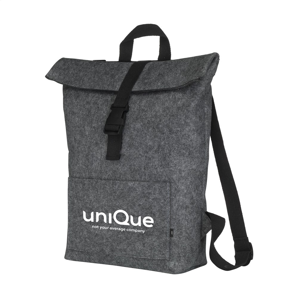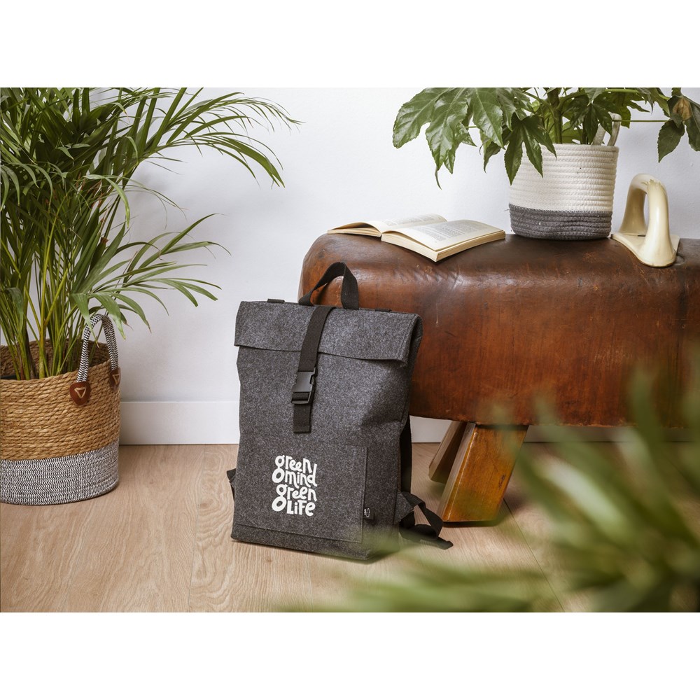 Robuster, praktischer „Roll-Top“-Rucksack aus stabilem RPET Filz. Der Rucksack hat ein geräumiges Innenfach und eine Tasche vorne. Mit Trageschlaufe, Rollverschluss und praktischem Klicksystem. GRS-zertifiziert. Gesamtes recyceltes Material: 80%. Fassungsvermögen ca.15 Liter.