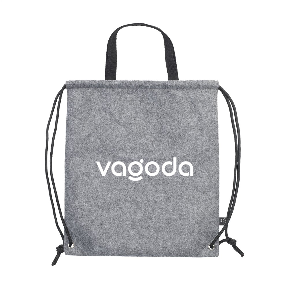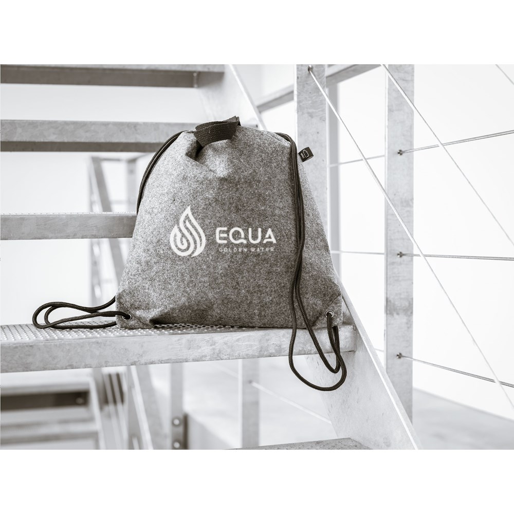 Rucksack aus RPET-Filz (hergestellt aus recycelten PET-Flaschen und recycelten Textilien). Mit Kordelzug und praktischen Trageschlaufen. GRS-zertifiziert. Recyceltes Material insgesamt: 82%. Fassungsvermögen ca. 10 Liter.