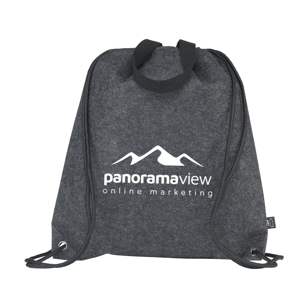 Rucksack aus RPET-Filz (hergestellt aus recycelten PET-Flaschen und recycelten Textilien). Mit Kordelzug und praktischen Trageschlaufen. GRS-zertifiziert. Recyceltes Material insgesamt: 82%. Fassungsvermögen ca. 10 Liter.