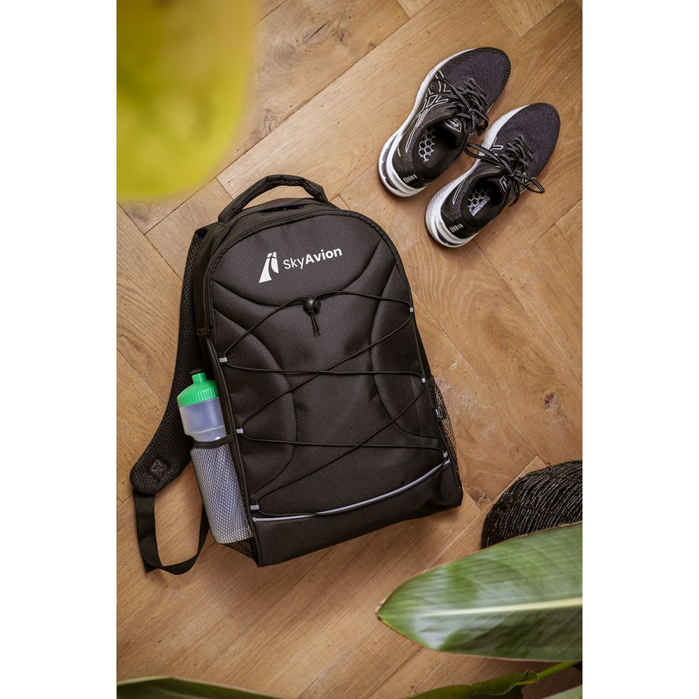 Rucksack aus robustem 600D RPET mit 2 Reißverschlussfächern. Die Fächer des großzügigen Hauptfachs sind mit schützendem Schaumstoff ausgestattet. Eines der Fächer ist für die Aufbewahrung eines Laptops bis zu 15,6 Zoll geeignet. Das andere Fach ist ideal für die Aufbewahrung kleinerer Accessoires, Dokumente oder eines Notizbuchs. Die seitliche Netztasche kann für den Transport einer Wasserflasche genutzt werden. An der Vorderseite der Tasche befindet sich ein praktisches Gummiband, das man festzurren kann – perfekt, um zum Beispiel eine Jacke oder einen Pullover zu transportieren. Für zusätzlichen Tragekomfort sind die Trageschlaufe, die verstellbaren Schulterriemen und die Rückseite mit Schaumstoff ausgestattet. Komplett gefüttert. Der Rucksack ist mit fluoreszierenden Akzenten auf der Vorderseite versehen. Damit ist man auch im Dunkeln gut sichtbar. GRS-zertifiziert. Gesamtes recyceltes Material: 97%. Fassungsvermögen ca. 20 Liter.