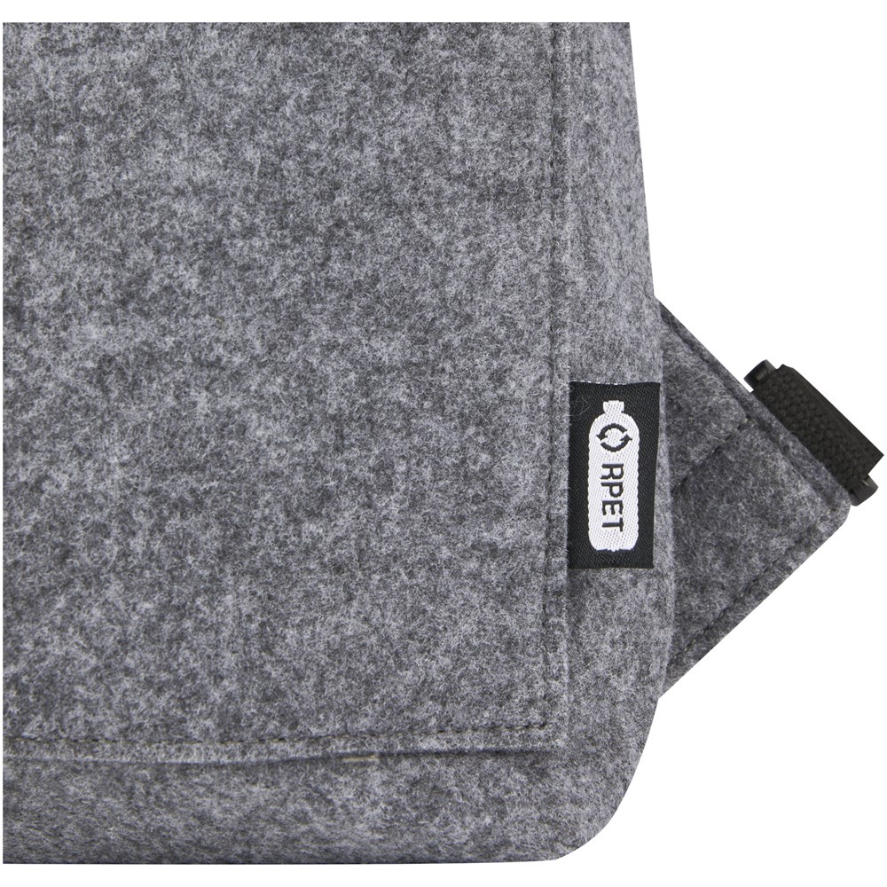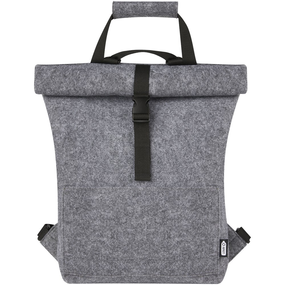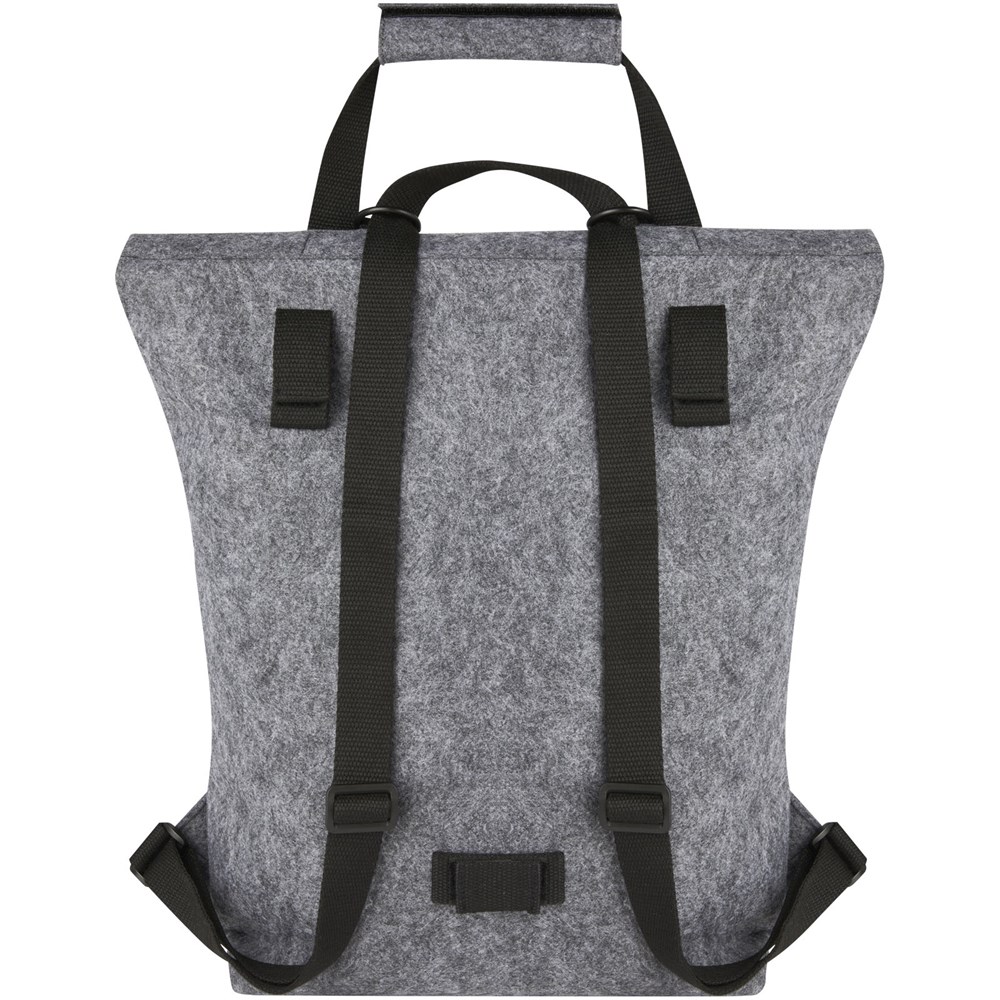 Multifunktionaler und modischer Rolltop-Rucksack und Fahrradtasche in einem. Aus hochwertigem, weichem und strapazierfähigem GRS-zertifiziertem, recyceltem Filz. Ausgestattet mit einem großen Hauptfach, einer Vordertasche, verstellbaren Schultergurten und 3 Klettverschlussgurten, mit denen die Tasche auf dem Gepäckträger eines Fahrrads befestigt werden kann. Die Schultergurte lassen sich leicht in ein langes Tragegriffsystem umwandeln oder so bündeln, dass sich die Gurte nicht in einem Fahrradrad verfangen können.
