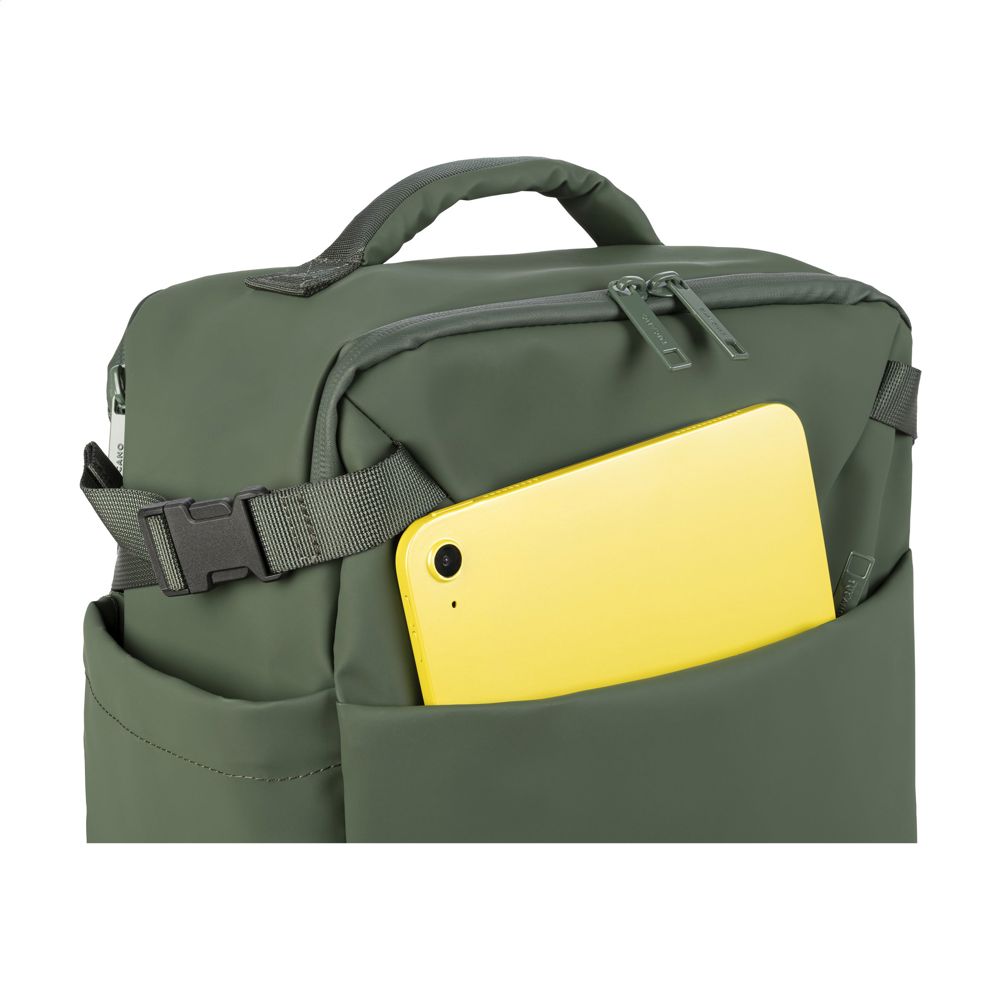 Handgepäckrucksack der italienischen Marke Tucano. Dieser Rucksack erfüllt die Größenanforderungen aller Billigfluggesellschaften. Hergestellt aus regenbeständigem, harzbeschichtetem Material, das aus recyceltem Kunststoff hergestellt wurde, darunter 23 recycelte PET-Flaschen. Auch die Reißverschlüsse sind regenbeständig. Dieser reisefreundliche Kabinenrucksack verfügt über ein geräumiges Innenfach für Kleidung und Accessoires, ein großes Reißverschlussfach auf der Vorderseite und ein Seitenfach für einen Regenschirm oder eine Wasserflasche. Mit einem gepolsterten Fach auf der Rückseite für Laptops bis zu 15,6 Zoll oder ein MacBook Pro 16 Zoll. Auf der Rückseite befindet sich ein verstecktes Reißverschlussfach zur Aufbewahrung persönlicher Dokumente. Die Tasche ist vollständig gefüttert. Dank der gepolsterten Schultergurte und der beiden Griffe, einer oben und einer an der Seite, lässt sich diese Tasche immer bequem tragen. Dieser Rucksack wurde so konzipiert, dass er den Kabinenabmessungen aller Fluggesellschaften entspricht. Er passt unter den Sitz im Flugzeug und ist somit der ideale Begleiter auf Flugreisen. Fassungsvermögen ca. 23 Liter.