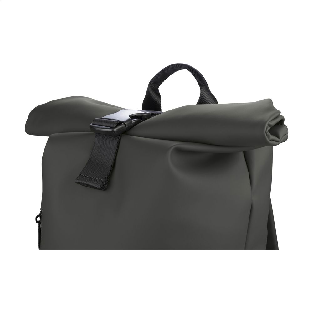 Sportlicher 'Rolltop'-Rucksack mit robustem Kunststoffverschluss der italienischen Marke Tucano. Hergestellt aus gummiartigen Materialien, die aus recyceltem Kunststoff, darunter 22 recycelte PET-Flaschen, hergestellt werden. Das wasserabweisende Material an der Außenseite ist überraschend geschmeidig und verleiht der Tasche einen eleganten und modernen Look. Ausgestattet mit einem großen Einzelfach mit einem internen, stoßfesten Laptopfach (bis zu 15,6 Zoll oder MacBook Pro 16 Zoll) mit einem Netzfach und einem geräumigen Reißverschlussfach an der Vorderseite für wichtige Accessoires. Komplett gefüttert. Die verstellbaren, gepolsterten Schultergurte und die atmungsaktive Netzrückseite sorgen für zusätzlichen Tragekomfort. Mit Trolley-Gurt und Trageschlaufe. PVC-frei. Ein idealer Rucksack für den täglichen Gebrauch. Fassungsvermögen ca. 22,5 Liter.