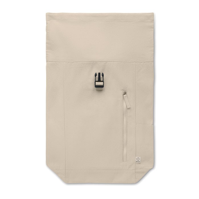 Rolltop-Rucksack mit Klettverschluss aus 390 g/m² (recycelte Baumwolle 80% und recycelter Polyester 20%). Fronttasche mit Reißverschluss.