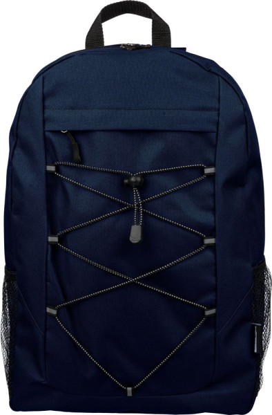 Abenteuerrucksack aus rPET-Polyester 600D mit Kordelzugverschluss und großem Hauptfach mit Reißverschluss. Mit Netzseitentaschen, elastischen Frontbändern zur Befestigung einer Decke oder Flasche und einer kleinen offenen Reißverschluss-Fronttasche zur Dekoration. Inklusive verstellbarer Riemen und rPET-Etikett.