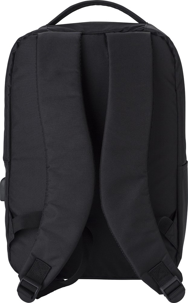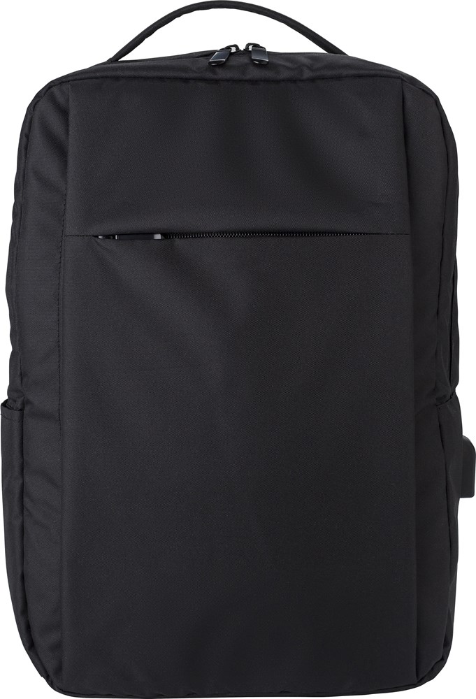 rPET (300D) Laptop (16 Zoll) Rucksack mit 210D Details. Innen mit mehreren Taschen, Laptop-Tasche mit Klettverschluss, eine Fronttasche mit Reißverschluss. Öffnung mit USB-A an der Seite.