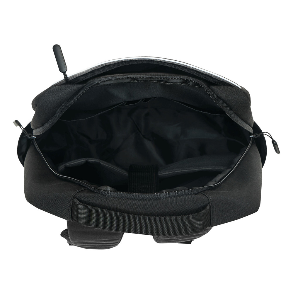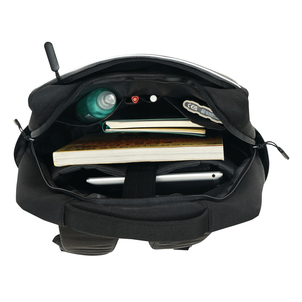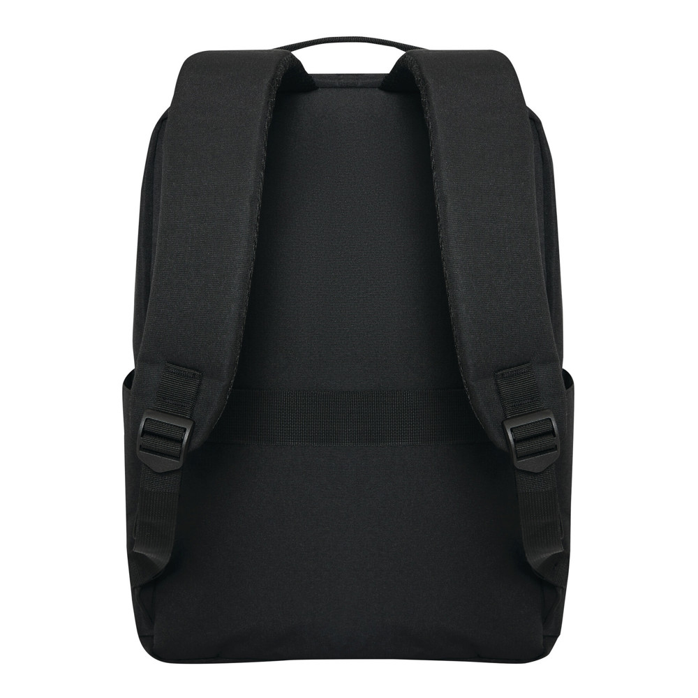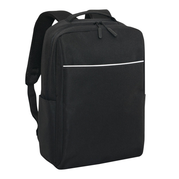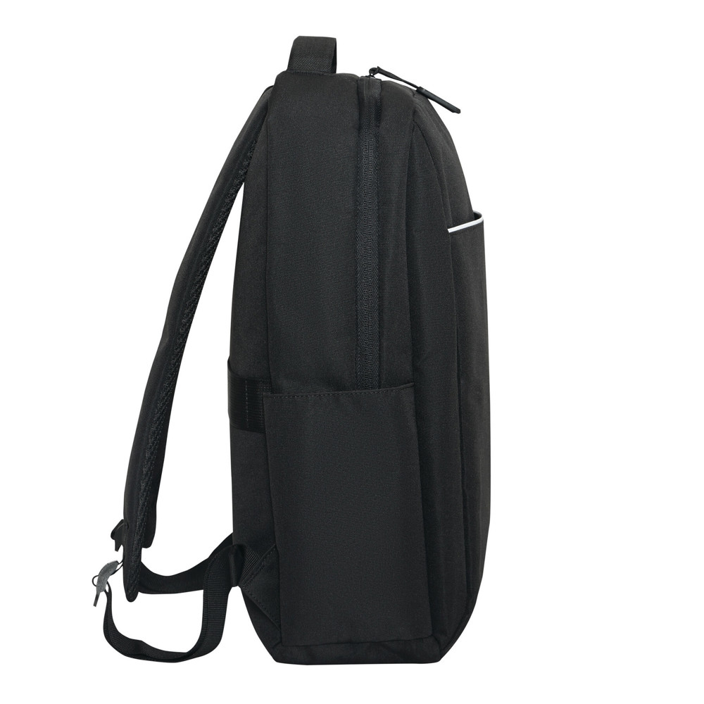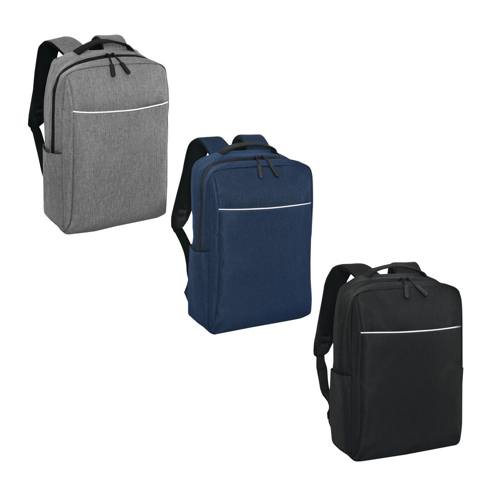 Rucksack GHENT: aus recyceltem Polyester (RPET), 1 Reißverschluss-Vorfach mit Reflektorstreifen, Reißverschluss-Hauptfach mit gepolstertem Innenfach für Laptop oder Tablet, Organizer mit 4 Steckfächern, 2 seitliche Einsteckfächer, gepolsterter Tragegriff, gepolsterte und verstellbare Schultergurte, Gurt als Reporterfunktion auf der Rückseite