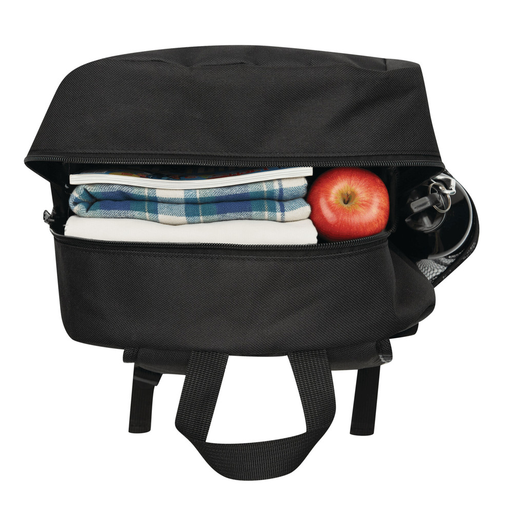 Rucksack FARO: aus recyceltem Polyester (RPET), Reißverschluss-Hauptfach, Reißverschluss-Vorfach mit verstellbarem, elastischem Kordelzug, Trageschlaufe, 1 seitliches Netzfach, gepolsterter Boden, verstellbare gepolsterte Schultergurte