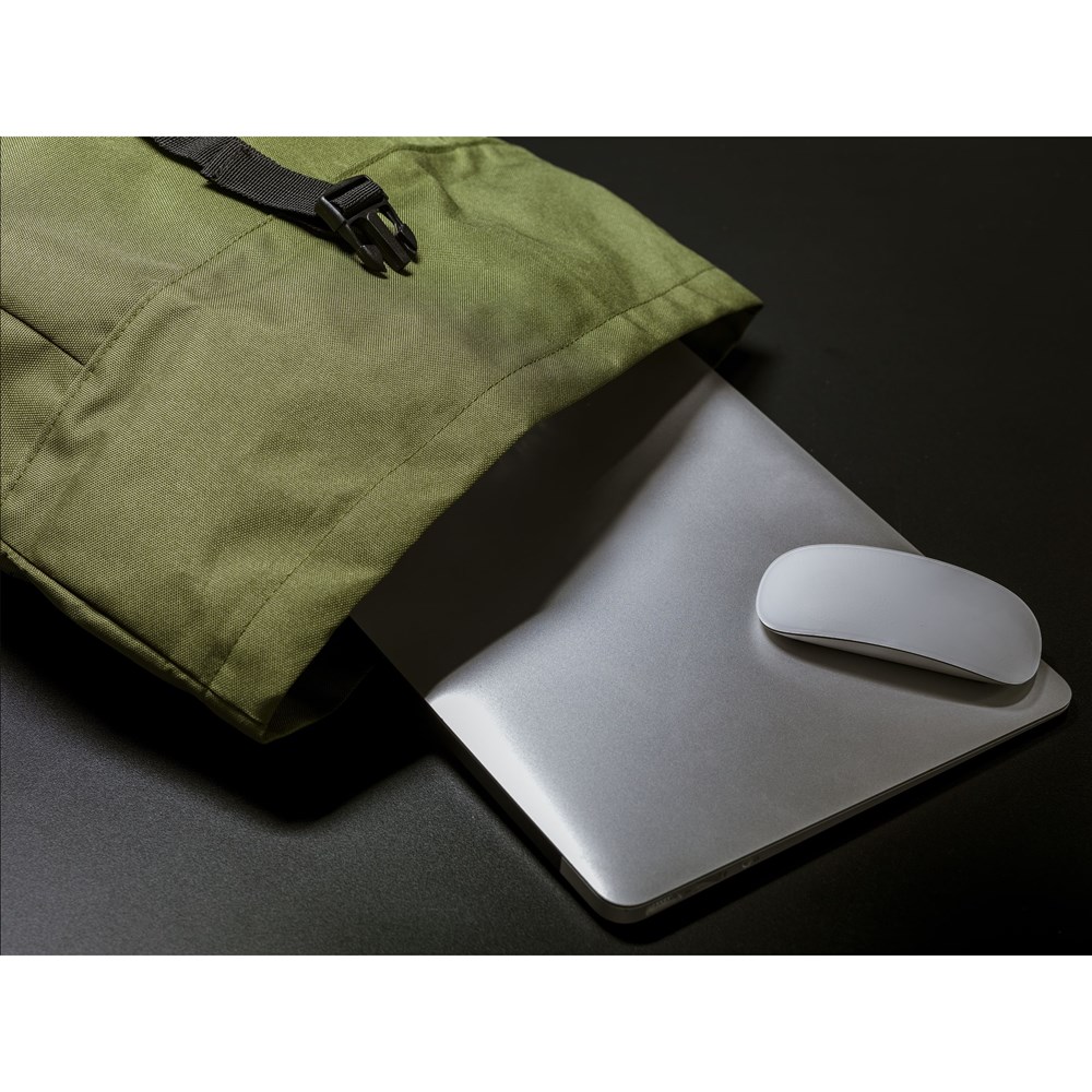 Praktischer, robuster und wasserabweisender „Roll-Top“-Rucksack aus RPET-Polyester. Der Rucksack hat ein großes Innenfach mit speziellem Laptopfach (bis zu 15,6 Zoll). Reißverschlusstasche auf der Vorderseite mit einem reflektierenden Akzent darunter (was die Sichtbarkeit im Dunkeln verbessert). Mit 2 Seitentaschen, Schaumrücken und gepolsterten, verstellbaren Schultergurten für mehr Tragekomfort, Trageschlaufe und Rollverschluss mit praktischem Klicksystem oben. Die perfekte Tasche für den täglichen Gebrauch. Gesamtes recyceltes Material: 51%. Fassungsvermögen: ca. 20 Liter.