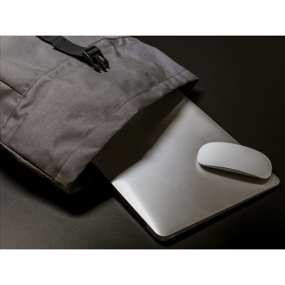 Praktischer, robuster und wasserabweisender „Roll-Top“-Rucksack aus RPET-Polyester. Der Rucksack hat ein großes Innenfach mit speziellem Laptopfach (bis zu 15,6 Zoll). Reißverschlusstasche auf der Vorderseite mit einem reflektierenden Akzent darunter (was die Sichtbarkeit im Dunkeln verbessert). Mit 2 Seitentaschen, Schaumrücken und gepolsterten, verstellbaren Schultergurten für mehr Tragekomfort, Trageschlaufe und Rollverschluss mit praktischem Klicksystem oben. Die perfekte Tasche für den täglichen Gebrauch. Gesamtes recyceltes Material: 51%. Fassungsvermögen: ca. 20 Liter.