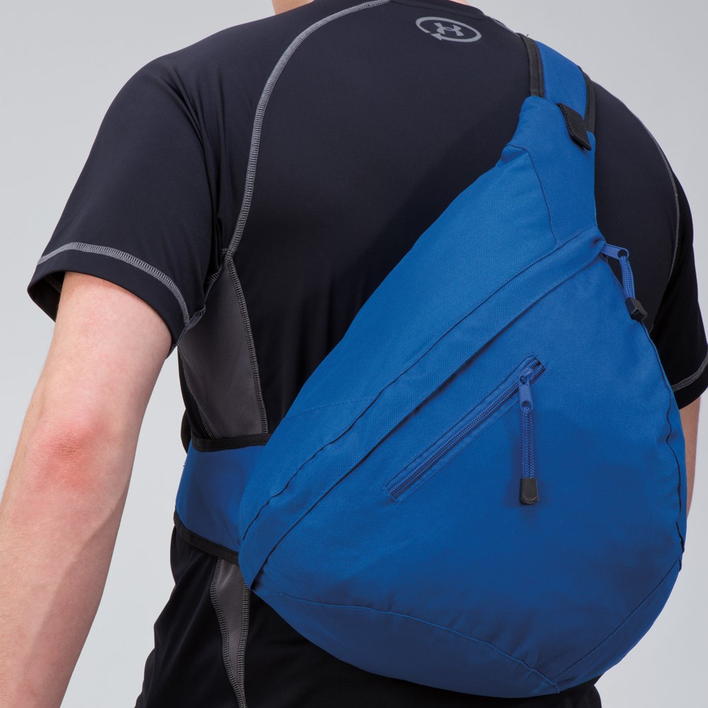 One-Shoulder-Rucksack aus strapazierfähigem 600D Polyester, geräumiges Hauptfach + Vorfach + Handyfach am Schultergurt. Ihre Werbung bringen wir unter dem zweiten Reißverschluss an.