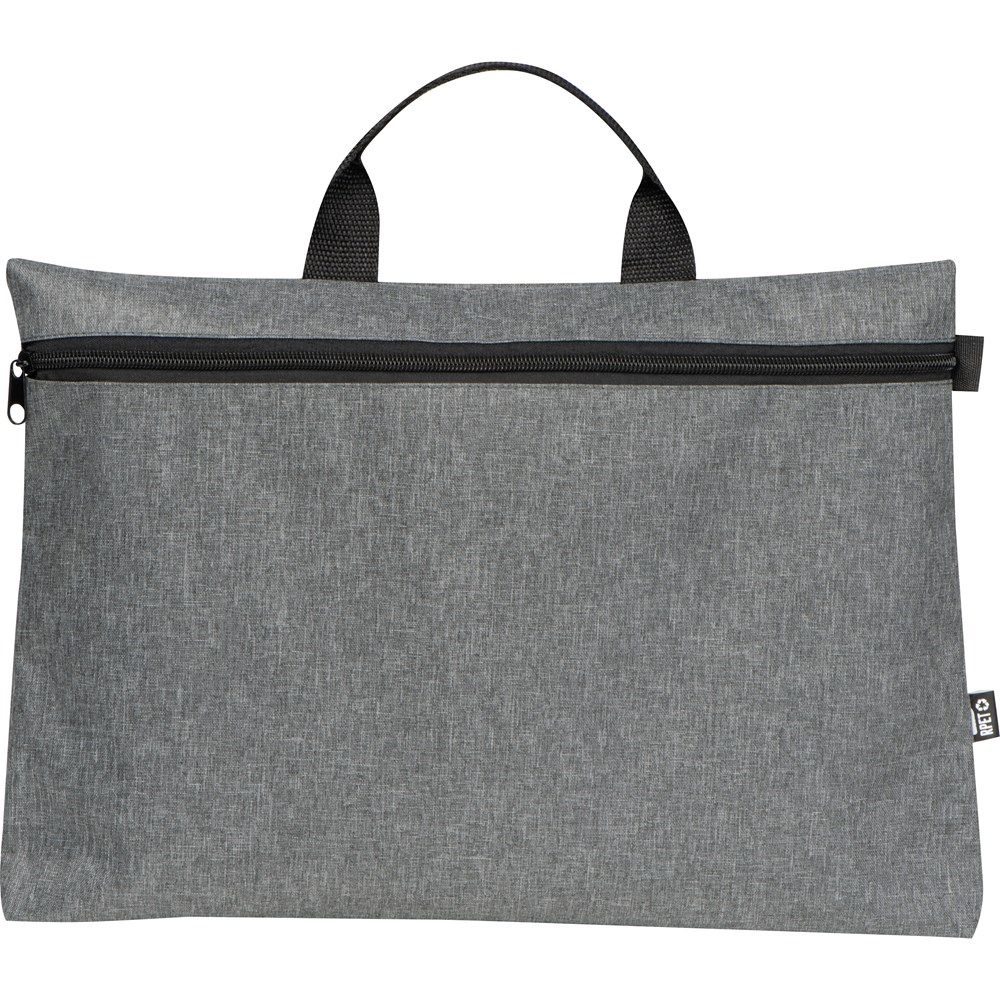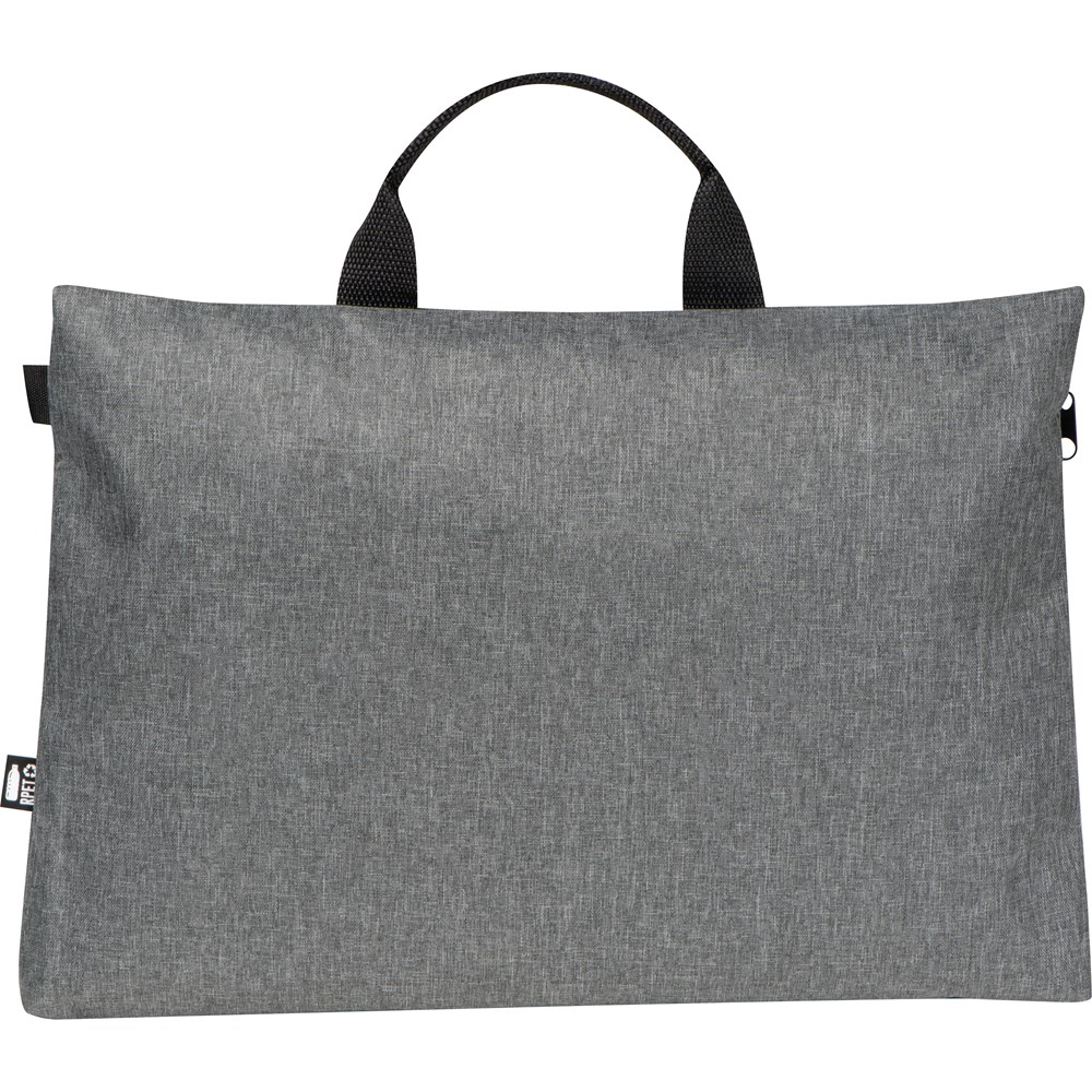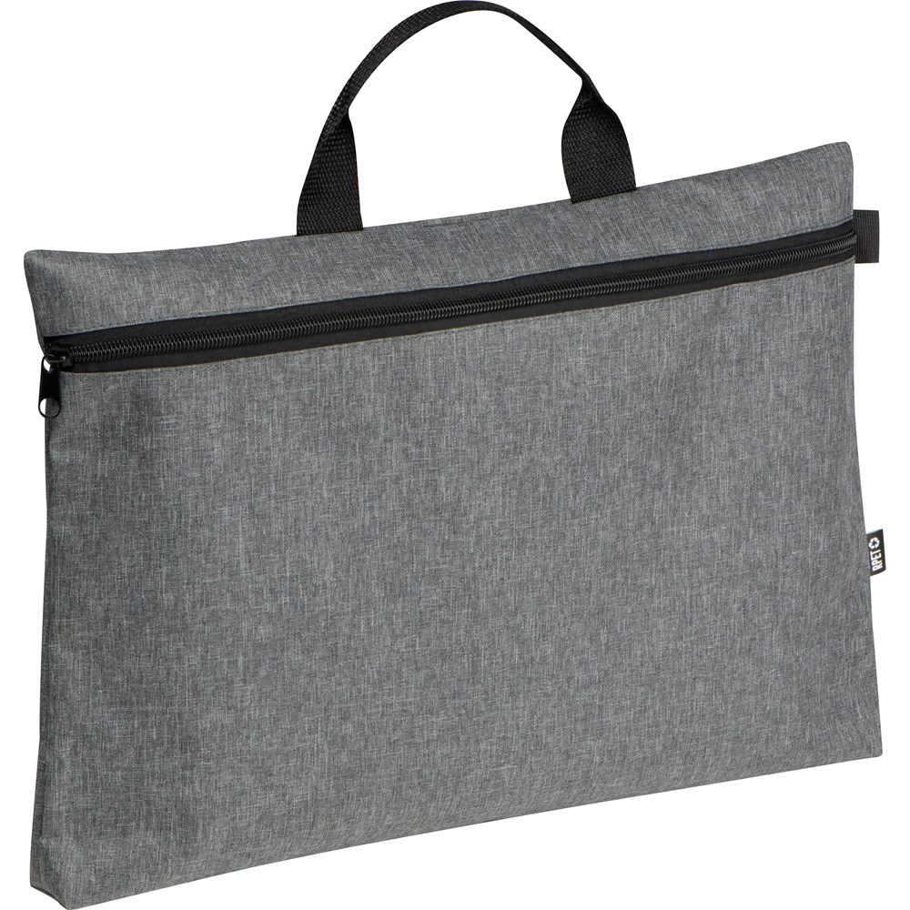 Dokumententasche aus recyceltem PET (300D). Sie verfügt über einen Reißverschluss und einen Tragegriff. Ihre Werbung drucken wir vorne mittig unterhalb des Reißverschlusses auf die Tasche.