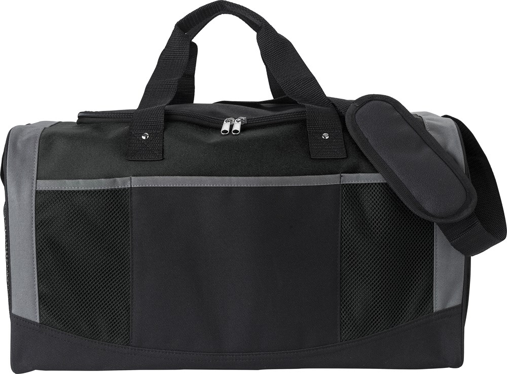 Seesack aus Polyester (600D) mit kurzen Griffen und verstellbarem Gurt. Ein großes Fach mit Reißverschluss, eine Netztasche an der Seite, 3 Fronttaschen. Verstärkter Boden.