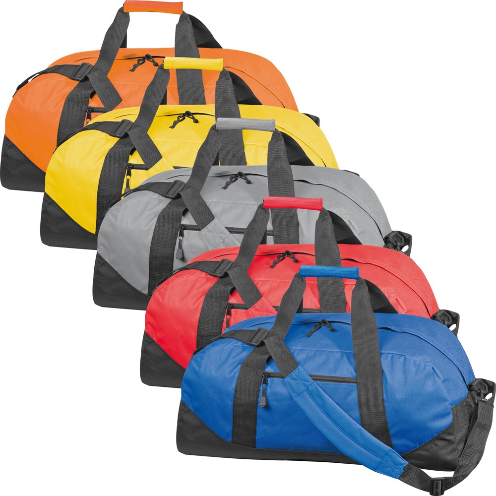 Robuste Sporttasche aus 600D Polyester, großes Hauptfach und kleines Vorderfach. Gepolsterter, stufenlos verstellbarer Gurt. Ihren Werbeaufdruck platzieren wir auf dem Vorderfach.