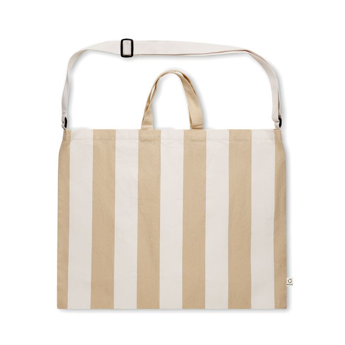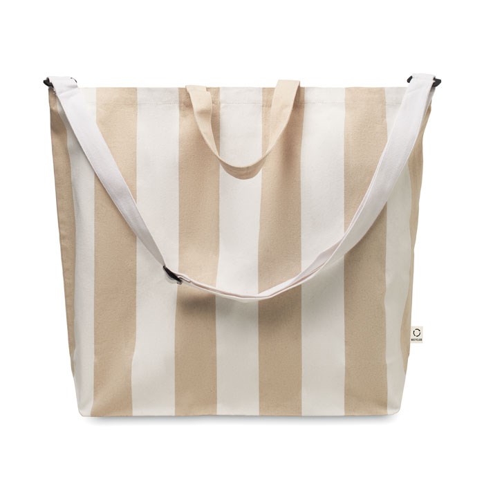 Extra große gestreifte Strandtasche aus 280 g/m² (recycelte Baumwolle 80% und recycelter Polyester 20%). Innentasche, kurze Tragegriffe und großer verstellbarer Schultergurt.