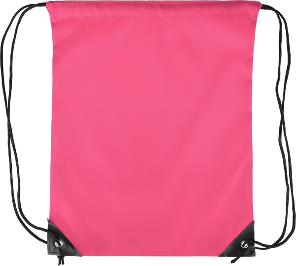 Rucksack aus Polyester 210D mit Kordelzug, zwei schwarzen PU-Ecken auf der Vorderseite und Innennähten. Mit einer schwarzen Nylonschnur auf jeder Seite, Kordelzugverschluss. Fassungsvermögen: 5 Liter. Tragkraft: 7 kg.