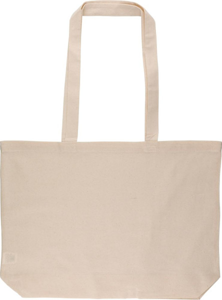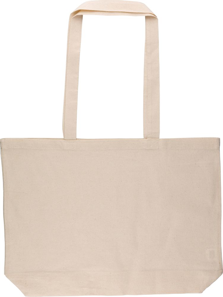 Einkaufstasche aus Baumwolle (140 g/m²) in Naturfarbe. Größe 48 × 34 × 10 cm mit 70 cm langen Henkeln (2,5 cm breit). Dieses Produkt ist OEKO-TEX® STANDARD 100 zertifiziert.