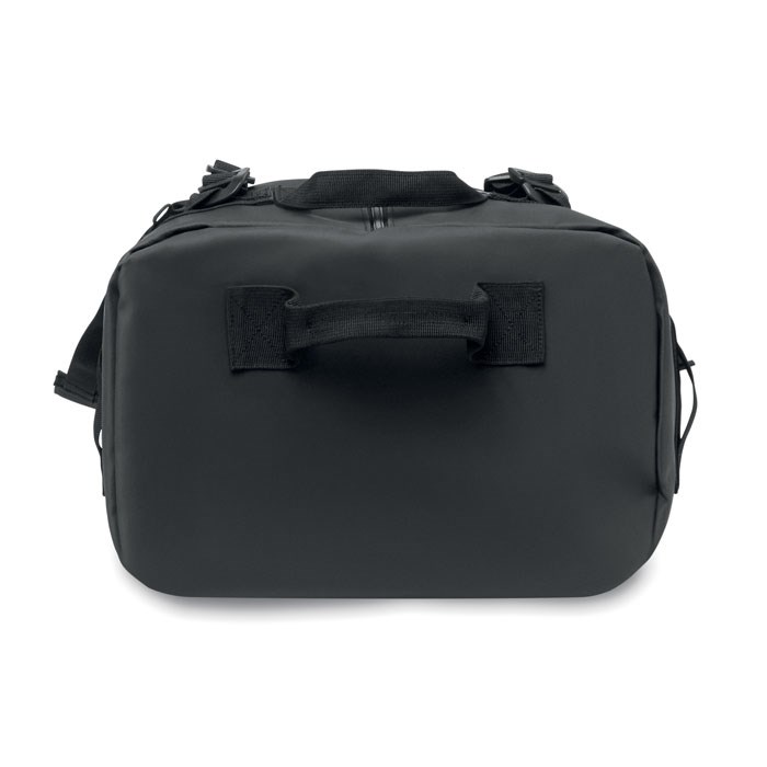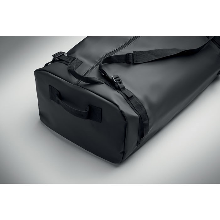Große Sport- oder Reisetasche, auch als Rucksack verwendbar. 50C-Plane. Innenfach mit Reißverschluss. Abnehmbarer, verstellbarer Schultergurt. Futter aus RPET.