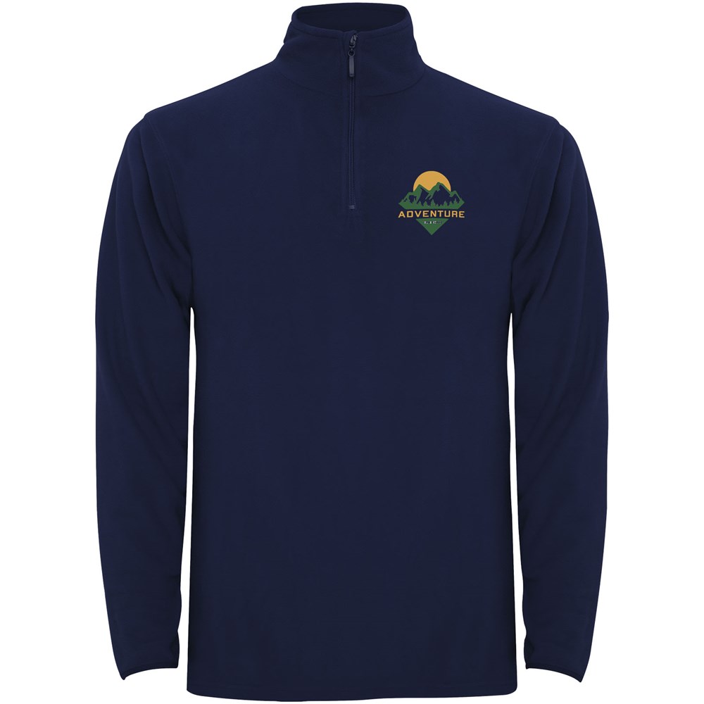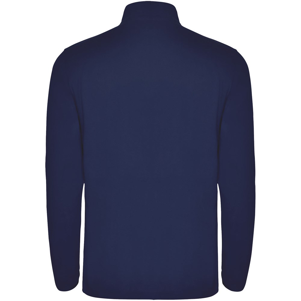 Mikrofleece mit halbem Reißverschluss im Nacken und Kinnschutz. Ärmelbündchen mit passendem Gummizug. Herausnehmbares Etikett. Das Modell ist 190 cm groß und trägt Größe L.