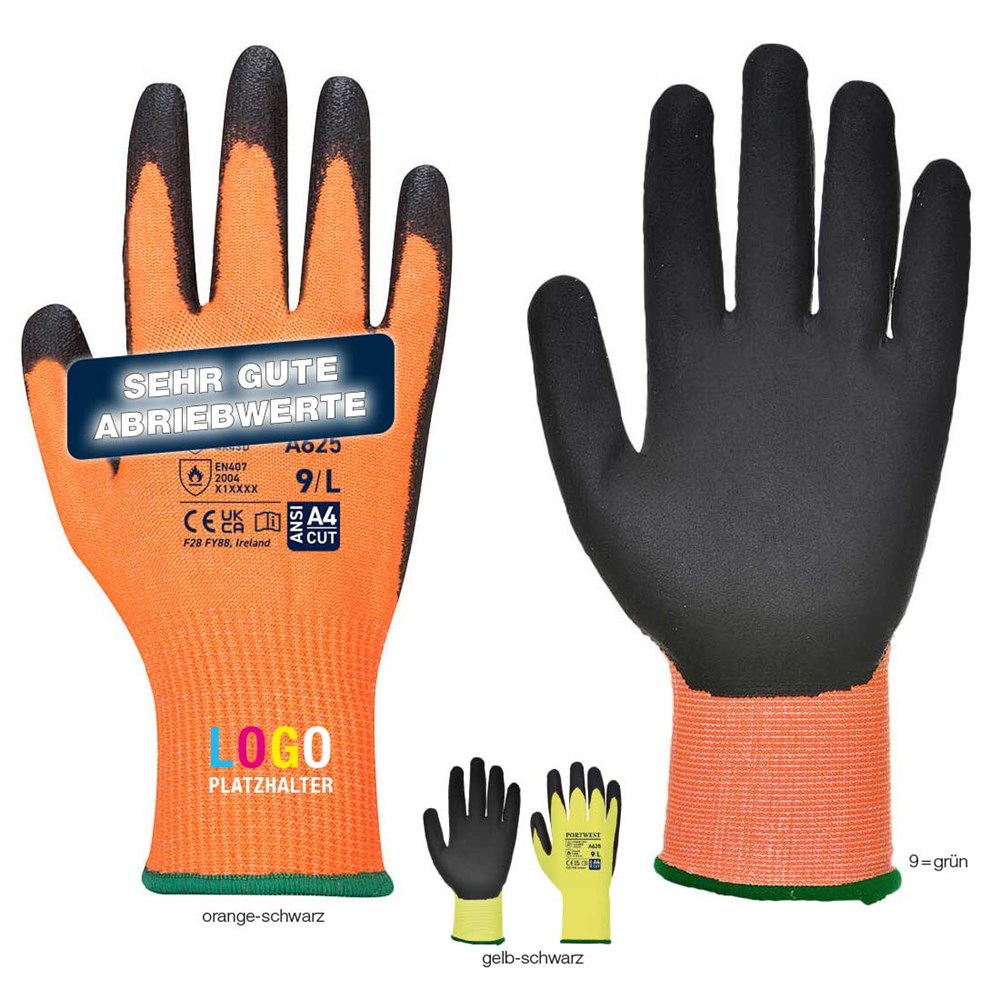 Unser HI-Vis Schnittschutzhandschuh HA 625 mit PU-Beschichtung hat sehr gute Abriebwerte. Das Trägergewebe bietet außerdem Schutz der Klasse 1 gegen Kontakthitze. Erhältlich in den Größen 7 bis 11. Die unterschiedlichen Farben der Bündchen markiert die Größe: 7=gelb, 8=weiß, 9=grün, 10=hellblau, 11=rot.