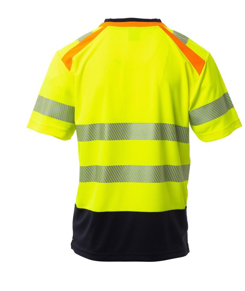 Unser Reflex T-Shirt ANNY, ist kurzärmelig, zweifarbig, V-Ausschnitt, hohe Sichtbarkeit. Feinripp-Kragen in Kontrastfarbe, verdeckte Nähte. Segmentierte, heißversiegelte Reflexstreifen auf Schultern, Ärmeln und Taille für eine gute Bewegungsfreiheit. Verstärkungsband in Kontrastfarbe. Seitenschlitze.